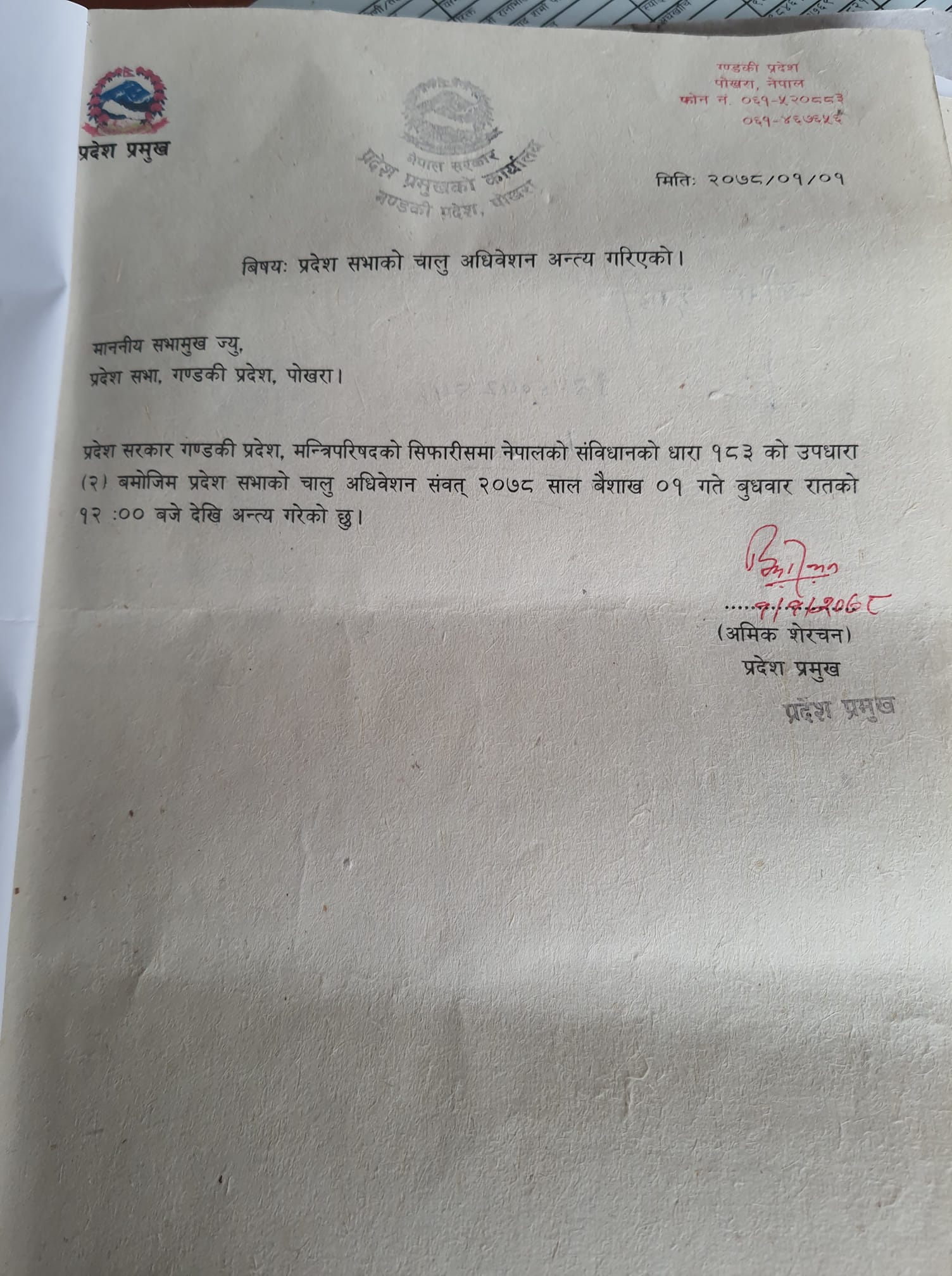 प्रदेश सरकारको सिफारिसमा प्रदेश प्रमुख अमिक शेरचनले वैशाख १ गते राति १२ बजेदेखि अधिवेशन अन्त्य गरेका हुन् ।विपक्षी गठबन्धनले मुख्यमन्त्रीविरुद्ध आजै अविश्वास प्रस्ताव दर्ताको तयारी गरेको छ।
