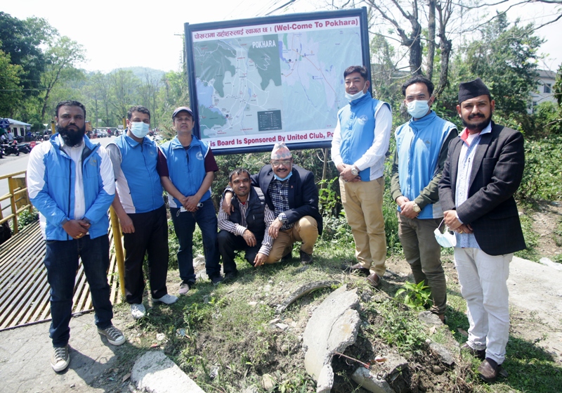 पोखरा, वैशाख ६ गते ।युनाईटेड क्लवको साताब्यापी कार्यक्रम अन्तर्गत पांचौ दिन पर्यटकीय क्षेत्र लेकसाइडको वैदाममा पोखराको पर्यटन क्षेत्रको पहिचान झल्किने होडिङ वोर्ड राखिएको छ । पोखराको पर्यटकीय क्षेत्रहरुलाई समावेश गरेर तयार गरिएको उक्त वोर्डको क्लवका संस्थापक अध्यक्ष हिमालय बख्रेलले उद्घाटन गरे ।