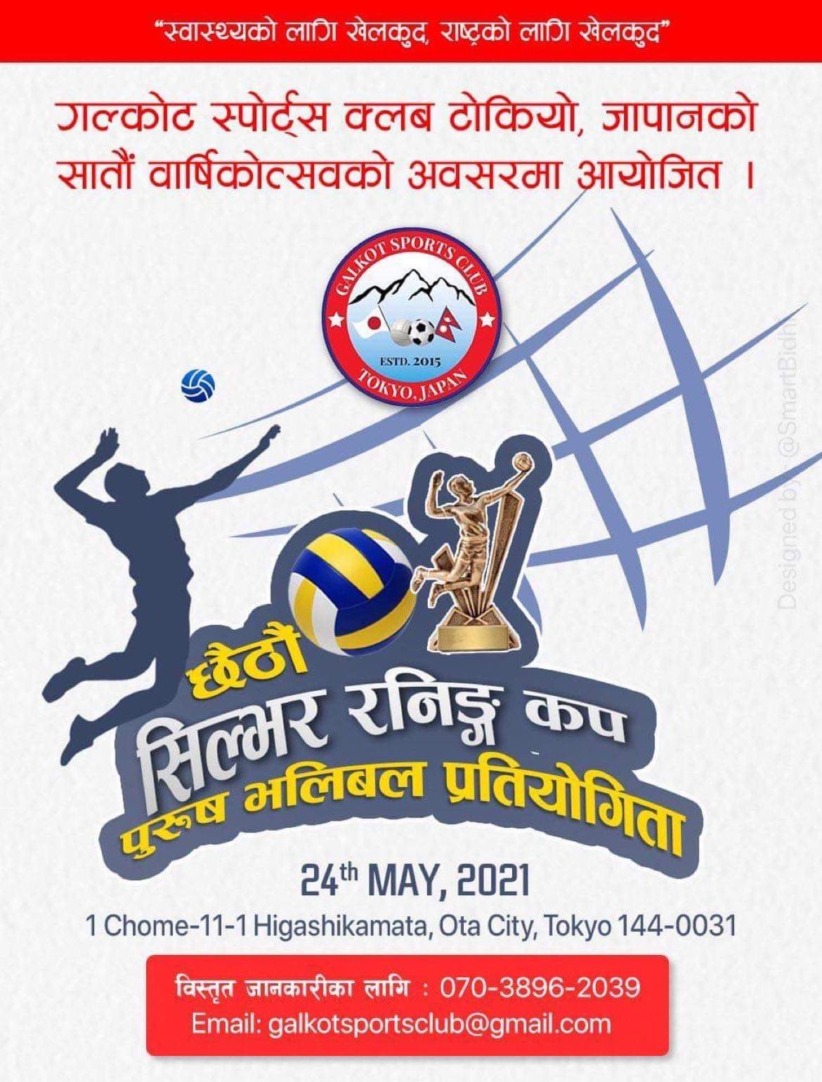 टोकियो २० अप्रिल /जापानको टोकियोमा स्थापित गल्कोट स्पोर्टस क्लब टोकियोले आफ्नो ७ औं बार्षिक उत्सबको अवसरमा हरेक बर्ष सम्पन्न गर्दै आईरहेको पुरुष भलिबल प्रतियोगिता यस पटक मे २४ तारिक सोमबार टोकियोको ओता सिटी हिगासी कामतामा गर्ने निर्णय गरेको छ । अप्रिल १९ तारिक कार्यसमितीको भर्चुअल बैठकबाट अध्यक्ष लक्ष्मण कार्कीको संयोजकत्वमा प्रतियोगिता संचालन मुल आयोजक समिती गठन गरिएको छ । प्रतियोगितामा सहभागिताका लागी जापानमा रहेका भलिबल खेलप्रेमी संघ सस्था र खेलाडीहरुलाई सहभागिताका लागी अनुरोध समेत गरिएको छ ।
