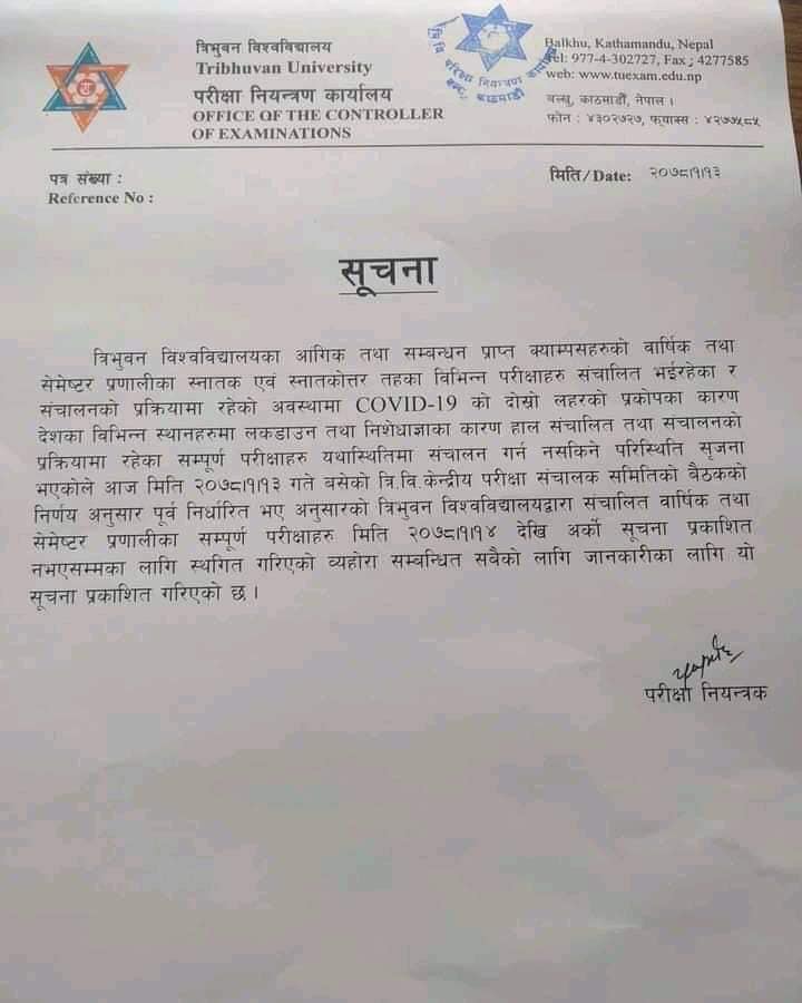 काठमाडौँ । त्रिभुवन विश्वविद्यालयले पुर्वनिर्धारित वार्षिक तथा सेमेष्टर प्रणालीका सबै परीक्षाहरु स्थगित गरेको छ ।सोमबार त्रिविले सूचना जारी गर्दै कोरोनाका कारण पूर्वनिर्धारित वार्षिक र सेमेष्टरका सम्पूर्ण परीक्षाहरु स्थगित गरेको हो ।