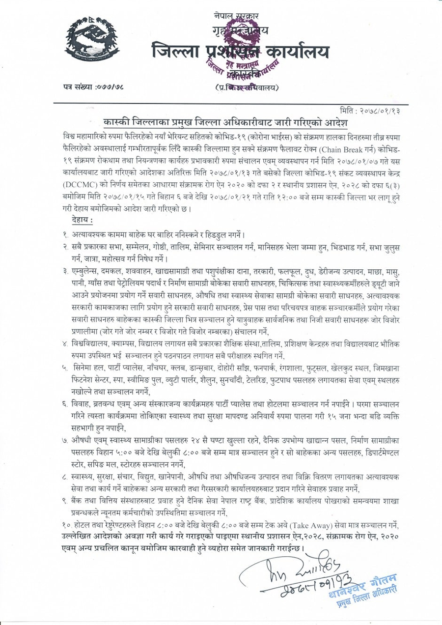 १३ वैशाख, पोखरा । जिल्ला प्रशासन कार्यालय, कास्कीले पर्सि बुधबारदेखि एक साताका लागि निषेधाज्ञा जारी गरेको छ ।