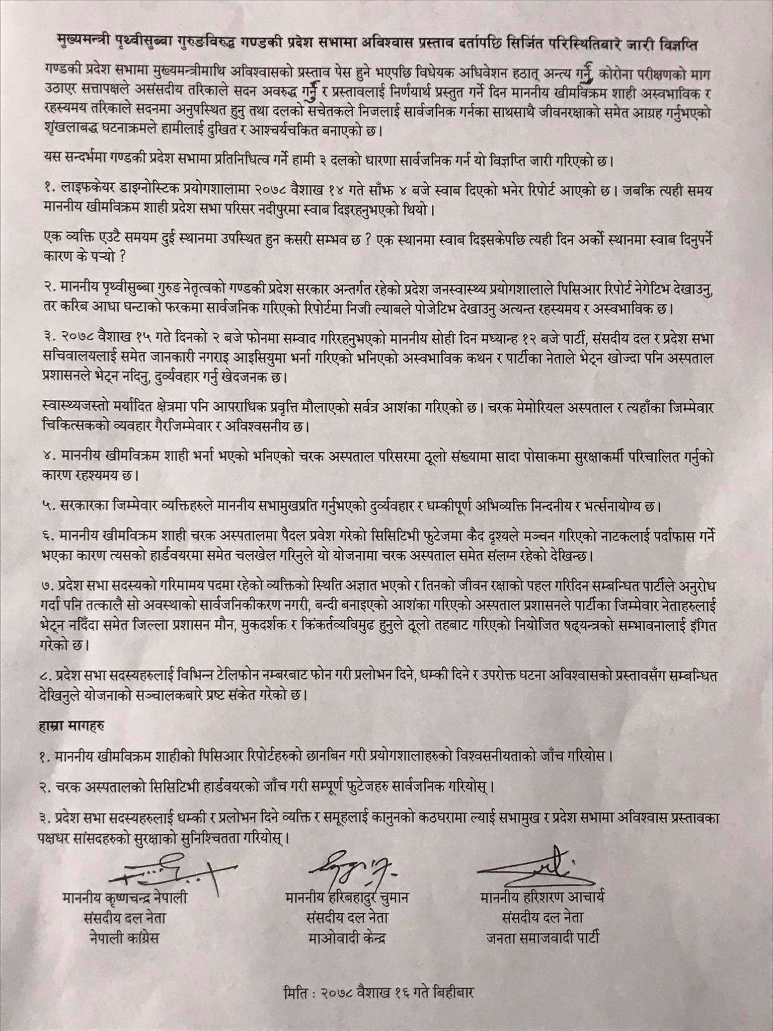 उनीहरुले शाहीको उपचार भइरहेको चरक अस्पतालमा सुरक्षाकर्मी परिचालन गर्नु रहस्यपूर्ण भन्दै त्यहाँको सीसीटीभी हार्डवेयरको जाँच गरी सम्पूर्ण फुटेज सार्वजनिक गर्न माग गरेका छन् ।त्यस्तै प्रदेशसभा सदस्यलाई धम्की र प्रलोभन दिने व्यक्ति र समूहलाई कानुनको कठघरामा ल्याई सभामुख र अविश्वास प्रस्तावका पक्षधर सांसदको सुरक्षा सुनिश्चित गर्न माग गरेका छन् ।