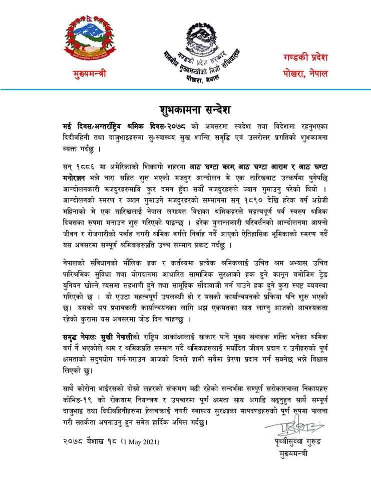 पोखरा, बैशाख १८ गते । १३२औँ अन्तर्राष्ट्रिय श्रमिक दिवस को अवसरमा गण्डकी प्रदेशका मुख्यमन्त्री पृथ्वीसुब्बा गुरुङले शुभकामना ब्यक्त गर्नुभएको छ । मुख्यन्त्री गुरुङले शुभकामना सन्देश जारी गदै श्रमिक दिवसको अवसरमा स्वदेश तथा विदेशमा रहनुभएका दिदीबहिनी तथा दाजुभाईहरुमा सुस्वास्थ्य,शुख शान्ति र समृद्धि सहित प्रगतिको शुभकामना ब्यक्त गर्नुभएको छ ।