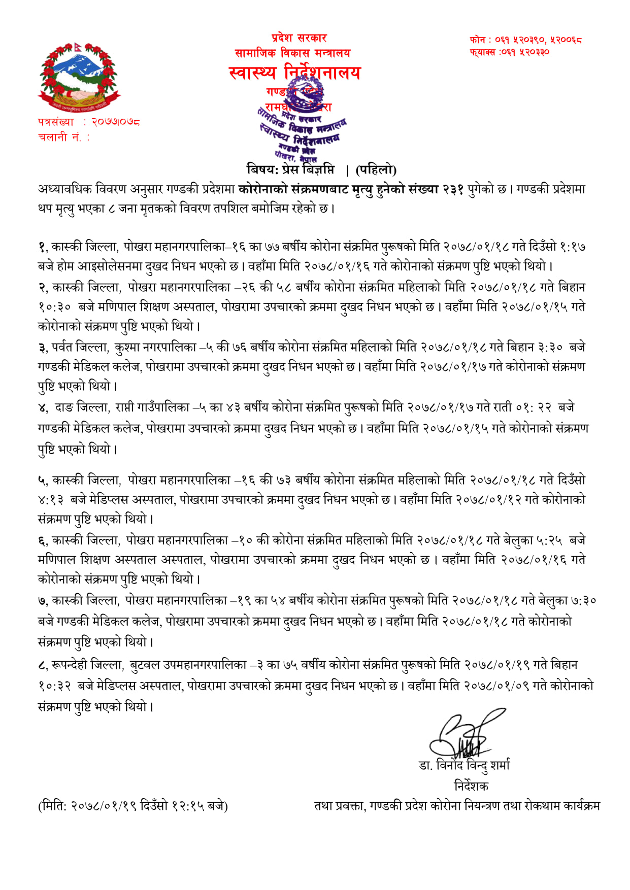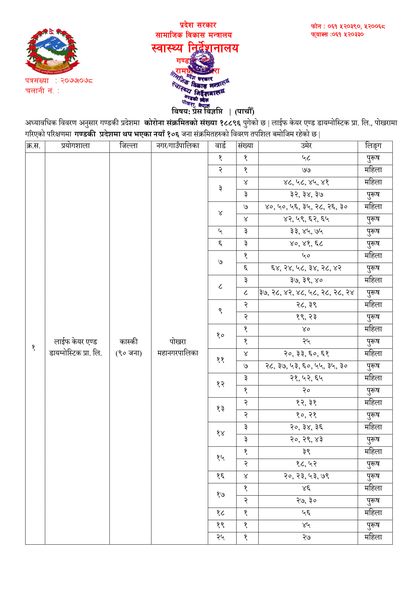 यस्तै पोखरा महानगरपालिका– २६ का ५८ वर्षीय पुरुषको मणिपाल शिक्षण अस्पताल, पर्वत कुश्मा नगरपालिका– ५ का ७६ वर्षीय महिला, दाङ राप्ती गाउँपालिका– ५ का ४३ वर्षीय पुरुष र पोखरा महानगरपालिका– १९ का ५४ वर्षीय पुरुषको गण्डकी मेडिकल कलेज पोखरा, पोखरा महानगरपालिका– १६ का ७३ वर्षीय महिला, पोखरा महानगरपालिका– १० महिला र रुपन्देही बुटवल उपमहानगरपालिका– ३ का ७५ वर्षीय पुरुषको मेडिप्लस अस्पताल पोखरामा उपचारको क्रममा मृत्यु भएको निर्देशनालयका निर्देशक विनोद विन्दु शर्माले जानकारी दिनुभयो ।