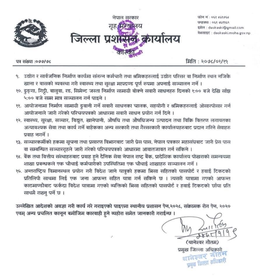 खाद्यान्न, डेरी पसल, बिहान ५ बजेदेखि ९ बजेसम्म खोल्न पाइने निर्णय भएको कास्कीका प्रमुख जिल्ला अधिकारी थानेश्वर गौतमले जानकारी दिए । औषधी पसल भने २४ घन्टा खोले पनि रोकतोक हुने छैन । यसअघि रेस्टुरेन्टमा टेक अवे सेवा सञ्चालन गरिएकोमा त्यो पनि बन्द हुनेछ ।