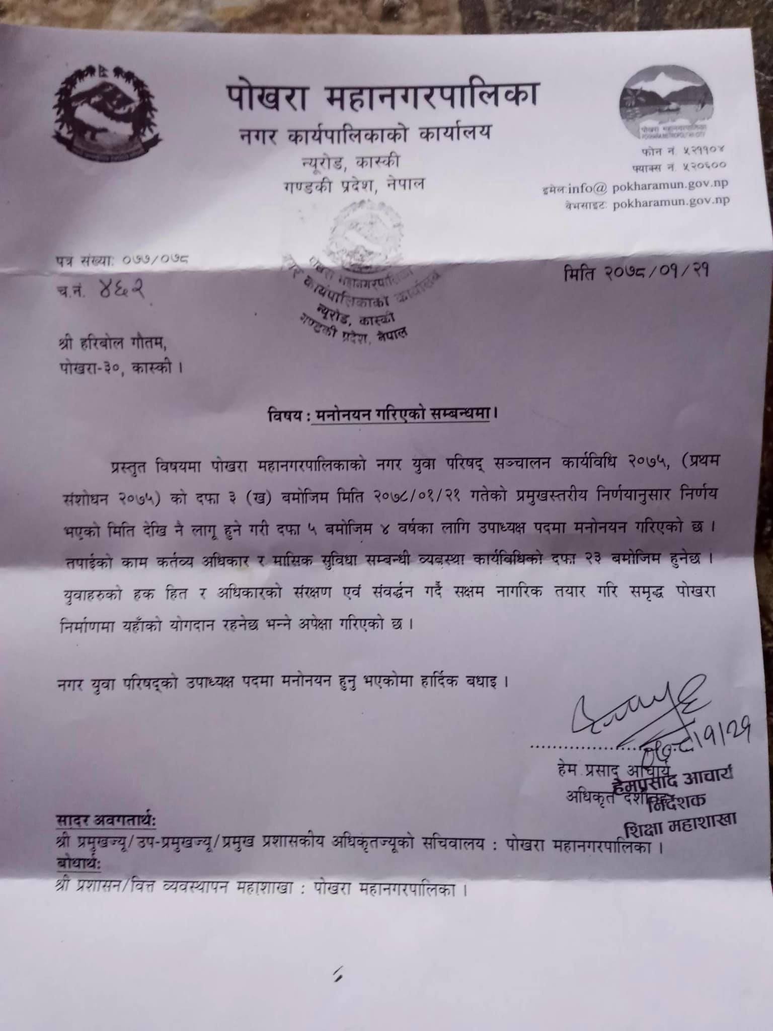 काम, कर्तब्य र अधिकारी र मासिक सुविधा कार्यविधिको दफा २३ बमोजिम हुने उल्लेख छ । युवाहरुको हक,हित र अधिकारको संरक्षण एवं सवद्र्धन गदै सक्षम नागरिक तयार गरि समृद्ध पोखरा निर्माणमा यहाँको योगदान रहने छ भन्ने अपेक्षा गरिएको छ उपाध्यक्षमा गौतमलाई दिइको नियुक्ति पत्रमा उल्लेख गरिएको छ ।
