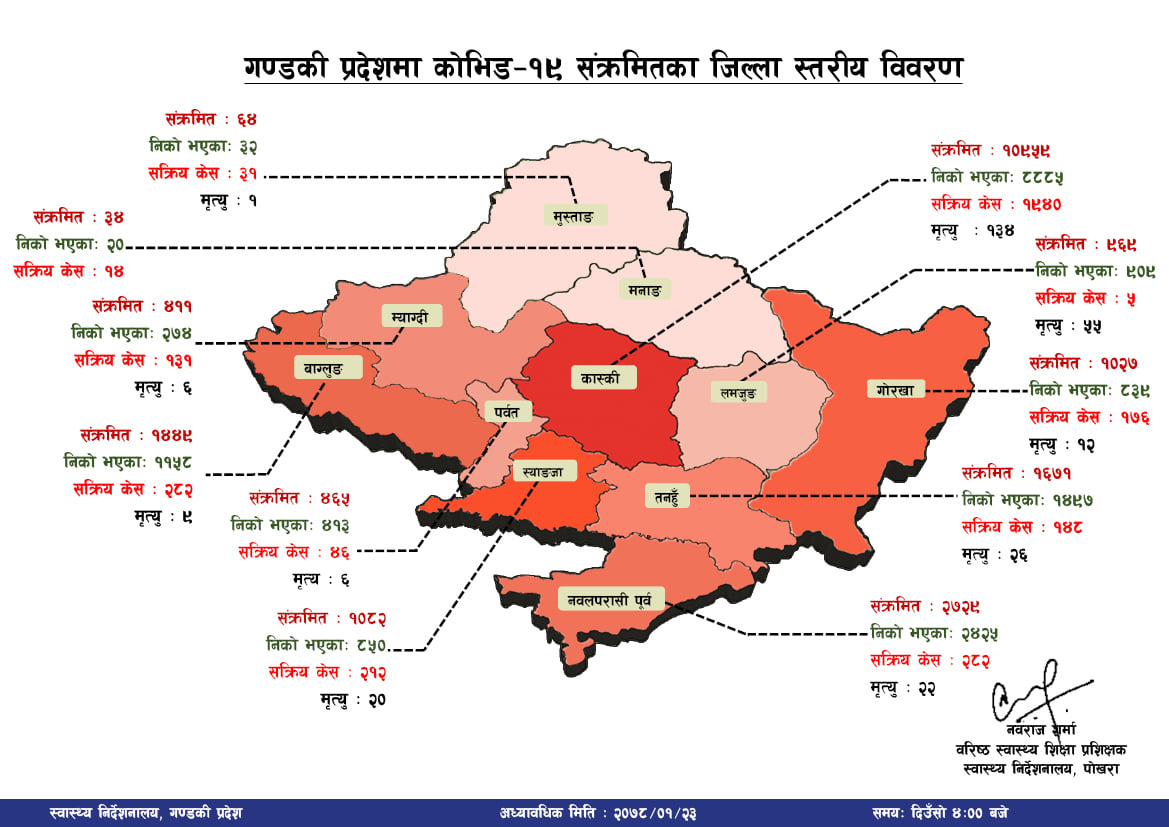 यसैवीच बिहिबार चार जनाको ज्यान गएको छ ।गण्डकी प्रदेशमा बिहिबार थप ४ जना कोरोना संक्रमितको मृत्यु भएको छ । प्रदेश स्वास्थ्य निर्देशनालयका अनुसार पोखराका तीन र म्याग्दीका एक जना सहित चार संक्रमितको उपचारको क्रममा मृत्यु भएको हो । पोखराका दुई अस्पतालमा उपचाररत संक्रमित तीन पुरुष र एक महिलाको ज्यान गएको हो ।मृत्यु हुनेमा पोखरा महानगरपालिका वडा नम्वर ३ का ८७ वर्षीय पुरुष,पोखरा २९ का ४१ वर्षीय पुरुष, पोखरा १७ का ७३ वर्षीय पुरुष र म्याग्दीको धौलागिरी गाउँपालिका २ की ७२ वर्षीय महिलाको मृत्यु भएको प्रदेश स्वास्थ्य निर्देशक डा। विनोदविन्दु शर्माले जानकारी दिनुभयो । पोखरा ४ का पुरुषमा बैशाख २१ गते संक्रमण पुष्टि भएको थियो भने पोखराकै चरक मेमोेरियल अस्पतालमा उपचारका क्रममा ज्यान गएको हो ।अरु तीन संक्रमितको पोखराको फुबारी स्थित मणिपाल शिक्षण अस्पतालमा उपचारकै क्रममा मृत्यु भएको हो ।