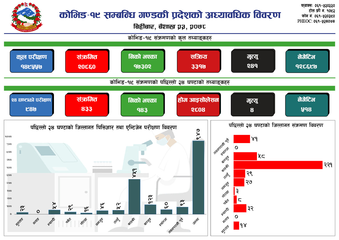 पोखरा, बैशाख २३ गते ।पोखरामा कोरोना संक्रमितको संख्या बिहिबार घटेको छ । गण्डकीमा पछिल्लो २४ घण्टामा ४३३ नयाँ संक्रमित थपिएका छन् । ९४७ को स्वाब परीक्षण गरिएकोमा ५१४ जनाको नेगेटिभ आएको छ ।