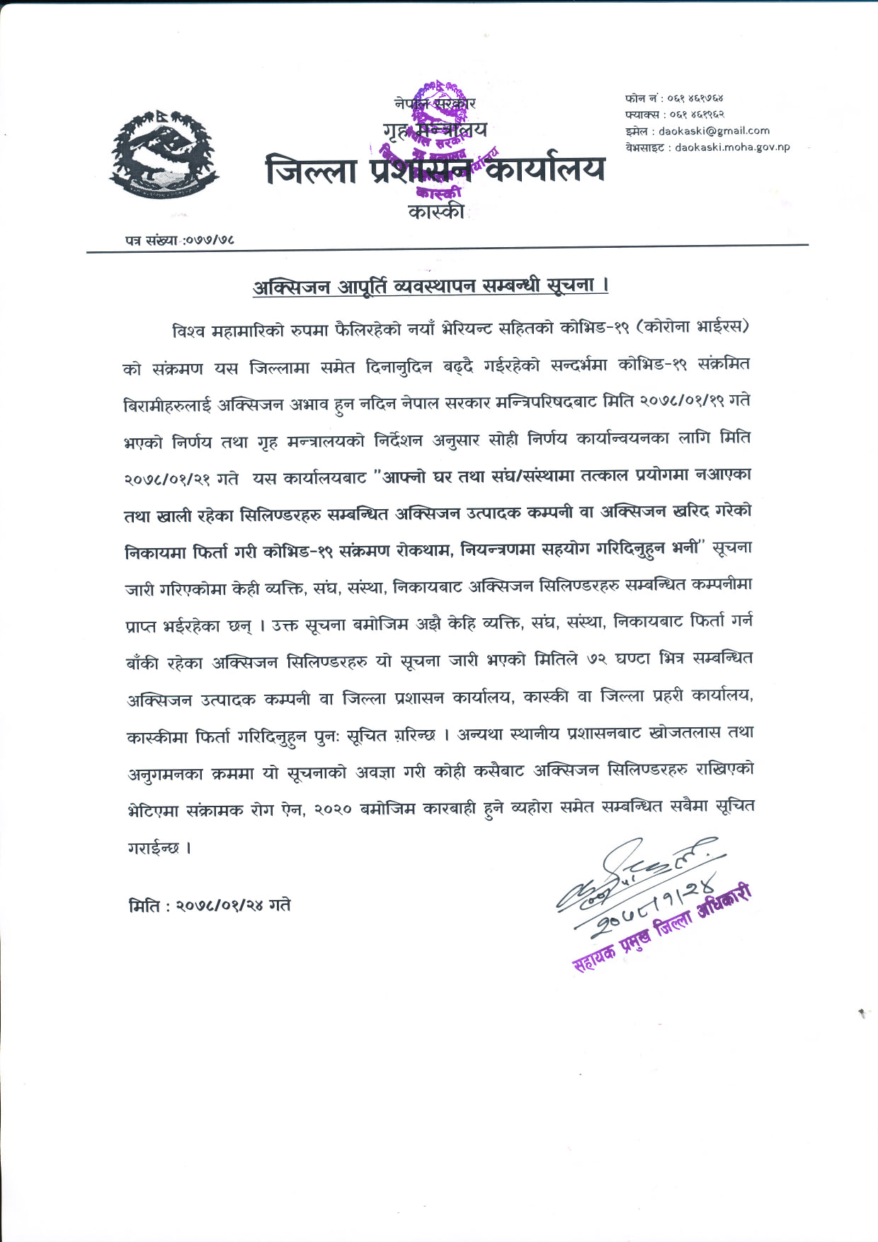 प्रशासनले सुचना जारी गरिएकोमा केही ब्यक्ति, संघसंस्था, निकायबाट अक्सिजन सिलिण्डरहरु सम्वन्धित कम्पनीमा प्राप्त भईरहेको जनाउदै सुचना बमोजिम अझै केहि ब्यक्ति संघसस्था र निकायबाट फिर्ता गर्न बाँकी रहेका सिलिण्डरहरु सूचना जारी भएको मितिले ७२ घटाभित्र सम्वन्धित अक्सिजन उत्पादक कम्पनी वा जिल्ला प्रशासन कार्यालय, जिल्ला प्रहरी कार्यालय कास्कीमा फिर्ता गर्न आग्रह गरेको छ ।