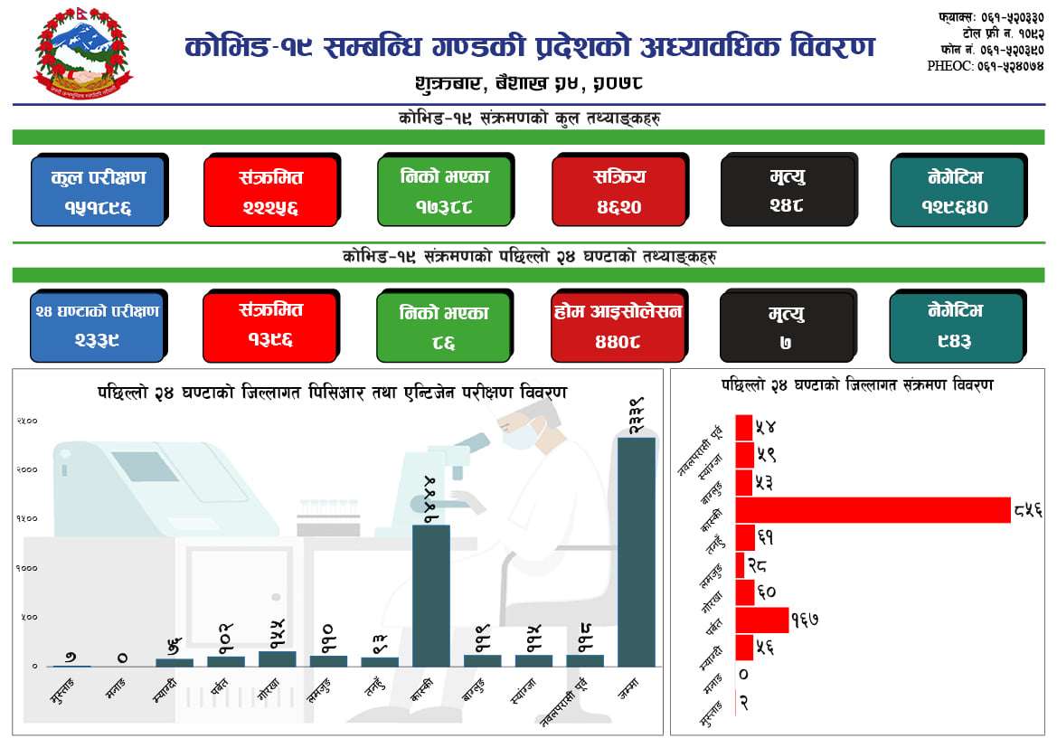 स्वास्थ्य निर्देशनालय गण्डकीले जारी गरेका दश विज्ञप्ति अनुसार गण्डकीमा अहिलेसम्मकै धेरै कोरोना संक्रमित थपिएका हुन् । थपिएका मध्य सबैभन्दा धेरै कास्कीका रहेका छन् । कास्कीमा आठ सय भन्दा बढि संक्रमित थपिएका छन् । यस्तै शुक्रबार सात कोरोना संक्रमितको मृत्यु भएको छ । उपचारका क्रममा पोखराका विभिन्न अस्पतालमा सात जनाको मृत्यु भएको स्वास्थ्य निर्देशनालय गण्डकीले जनाएको छ ।