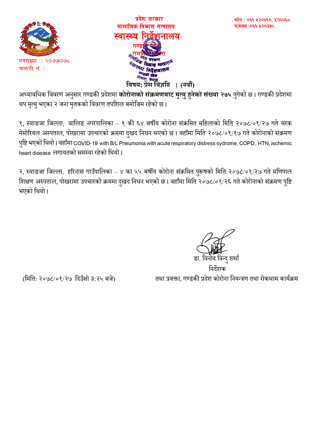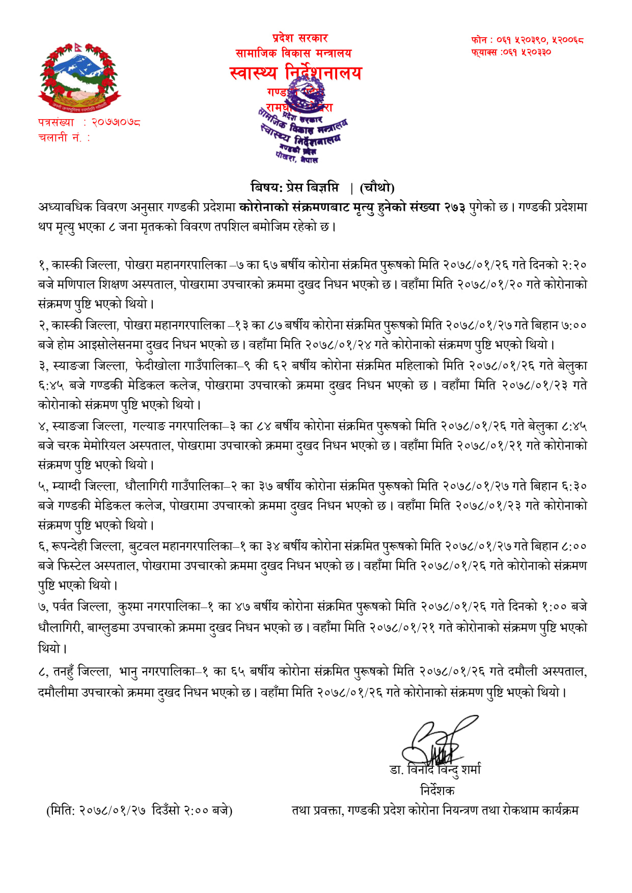 यस्तै म्याग्दीको धौलागिरी गाउँपालिका २ का ३७ वषीय पुरुषको गण्डकी मेडिकल कलेज पोखरामा निधन भएको हो । पर्वत जिल्ला कुश्मा नगरपालिका १ का ४७ वषीय पुरुषको धौलागिरी बाग्लुङमा उपचारका क्रममा निधन भएको हो । तनहुँ जिल्लाको भानु नगरपालिका १का ६५ वर्षिय पुरुषको दमौली अस्पतालमा उपचारका क्रममा निधन भएको छ ।त्यस्तै स्याङजा जिल्ला वालिङ नगरपालिका १की६४ वषीय कोरोना संक्रमित महिलाको चरक मोमोरिय अस्पताल पोखरामा निधन भएको छ।