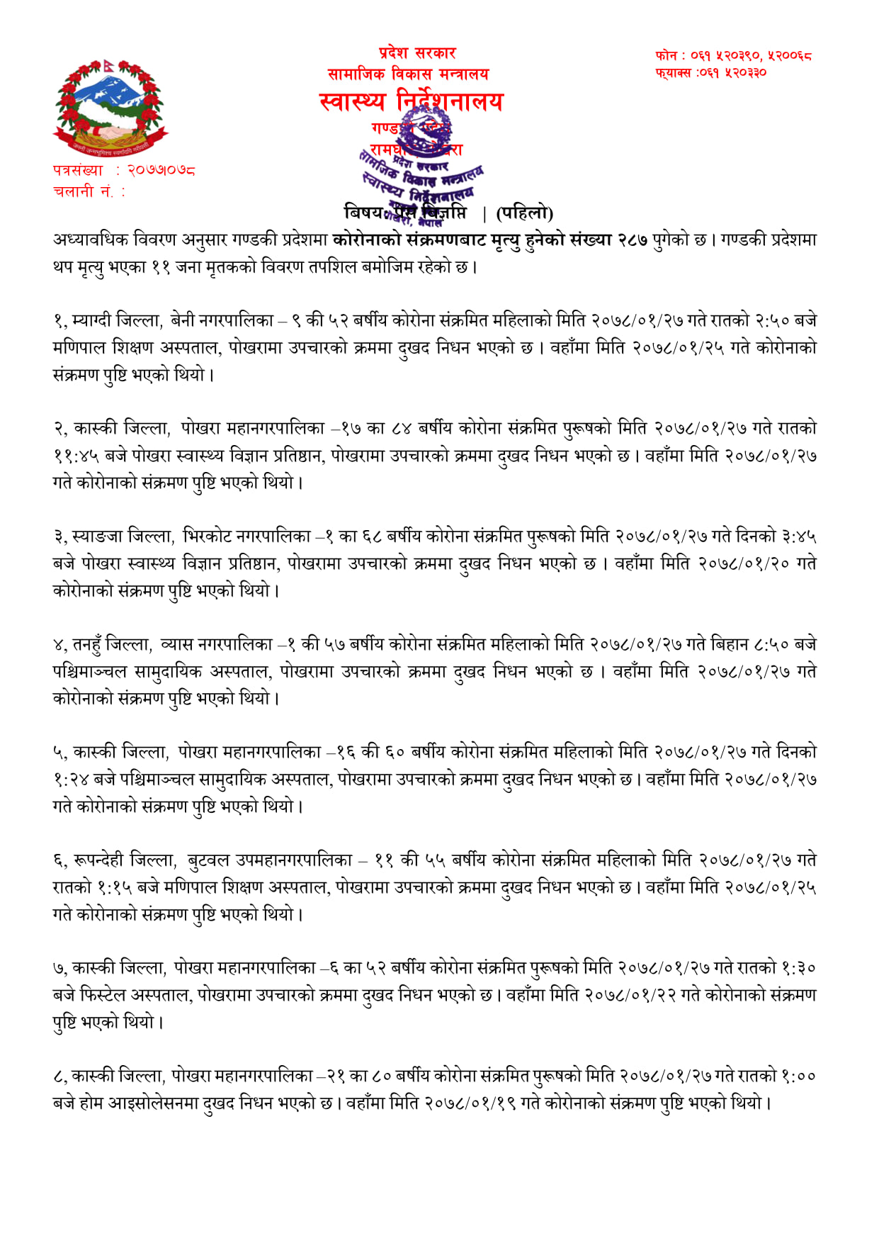रुपन्देही र म्याग्दीका २, स्याङ्जा र तनहुँका १÷१जनाको मृत्यु भएको हो । गण्डकीमा कोरोनाबाट मृत्यु हुनेको संख्या २८७ पुगेको छ ।