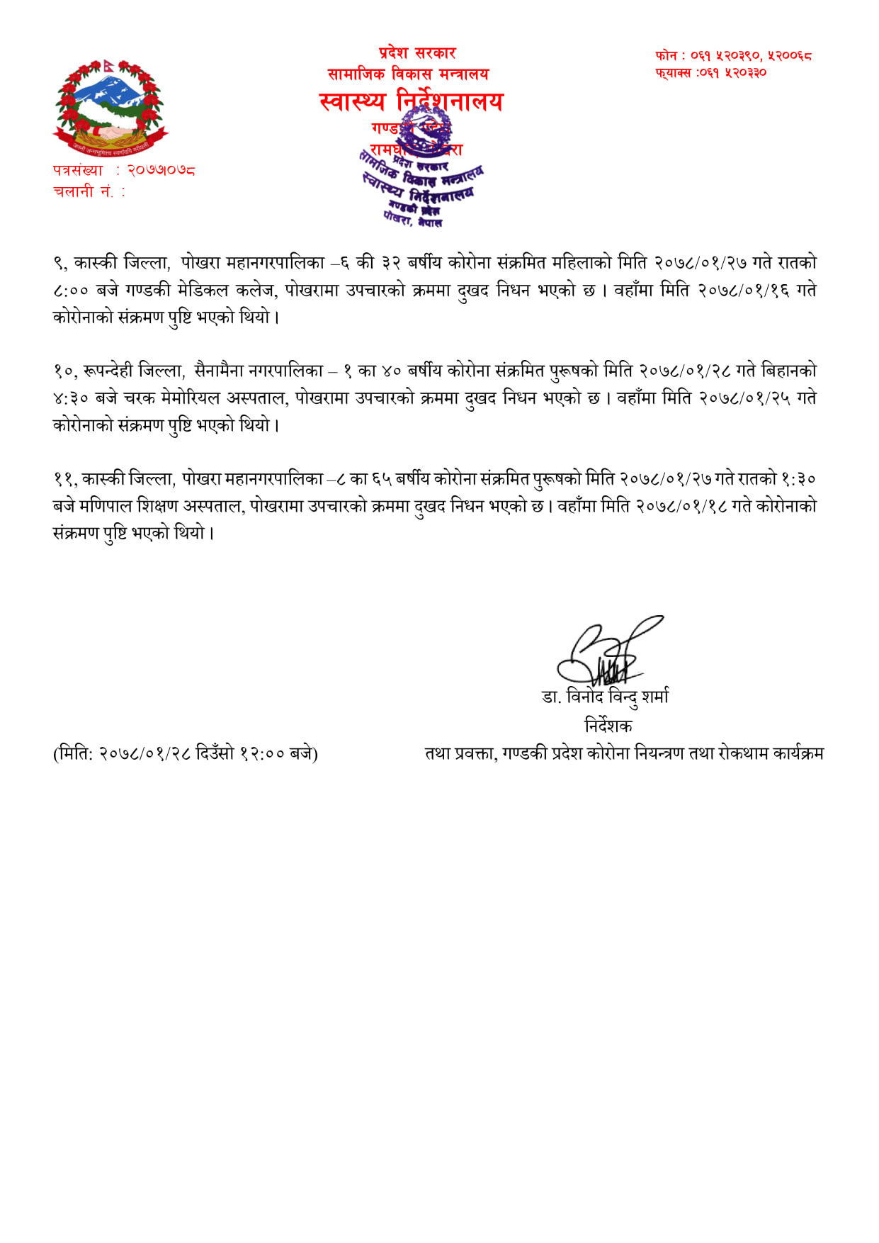 पोखराका विभिन्न अस्पतालमा उपचार गराई रहेका संक्रमितको मृत्यु भएको स्वास्थ्य निर्देशनालय गण्डकीले जारी गरेको पछिल्लो विवरणमा उल्लेख गरिएको छ ।