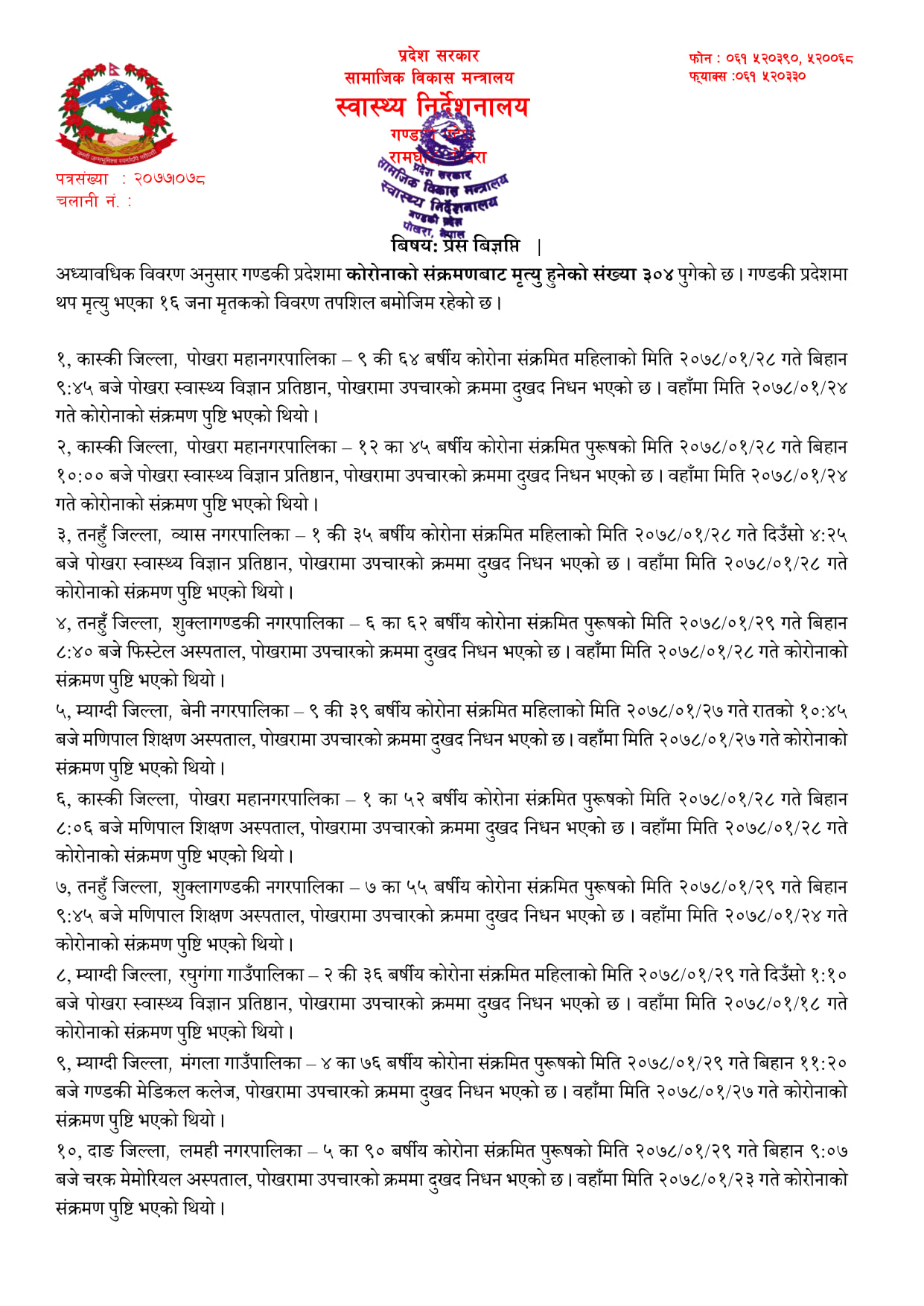 पोखराका सात सहित गण्डकीमा १६ जना संक्रमितको मृत्यु