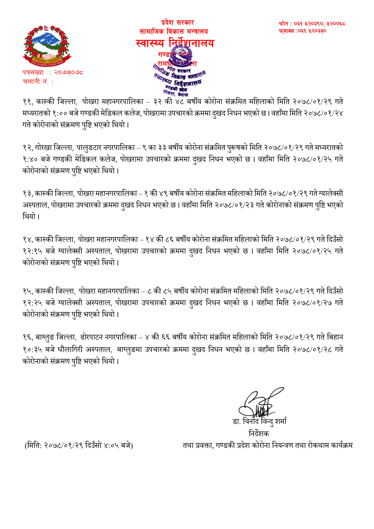 पोखरा, बैशाख २९ गते । गण्डकी प्रदेशमा कोरोना संक्रमित १६ जनाको मृत्यु भएको छ । पछिल्लो २४ घण्टामा पोखराका विभिन्न अस्पतालमा उपचारत संक्रमितको मृत्यु भएको स्वास्थ्य निर्देशनालय गण्डकीले जारी गरेको विज्ञप्तिमा जनाएको छ ।