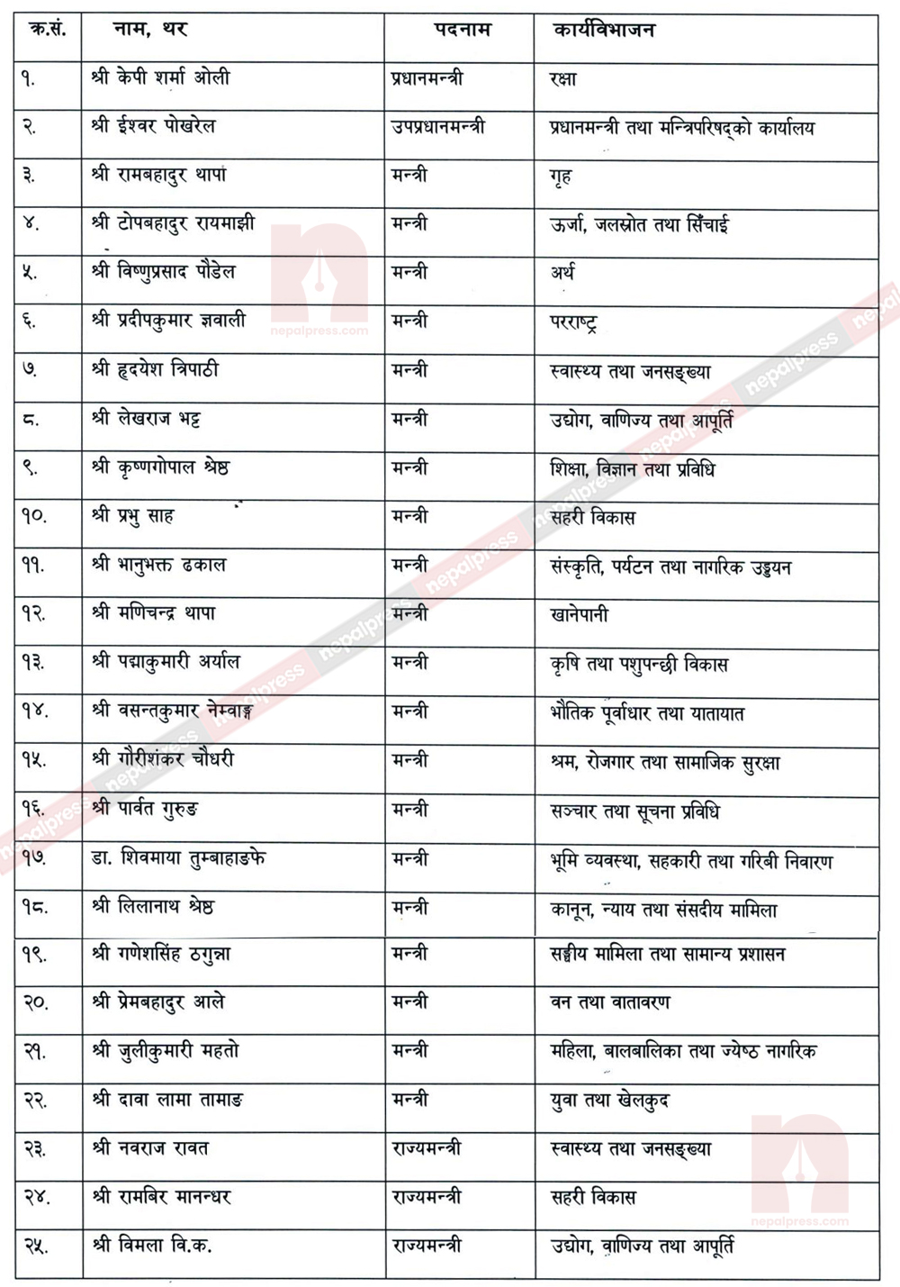 ओलीसँगै उनको मन्त्रिमण्डलका सदस्यले पनि पद तथा गोपनीयताको सपथ लिएका छन्। मन्त्रीहरूमा पुरानै अनुहार दोहोरिएका छन् । साथै उनीहरूले साविककै मन्त्रालयको जिम्मेवारी पाएका छन् ।