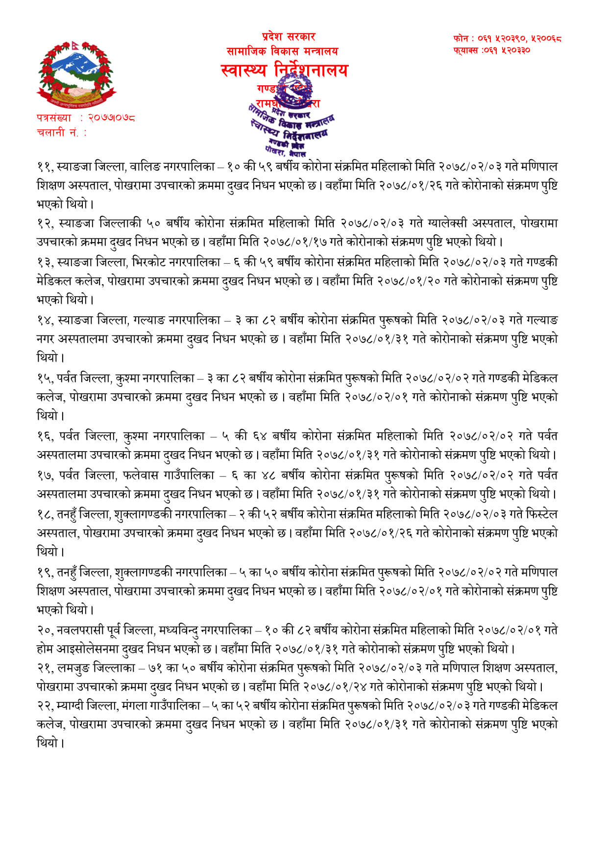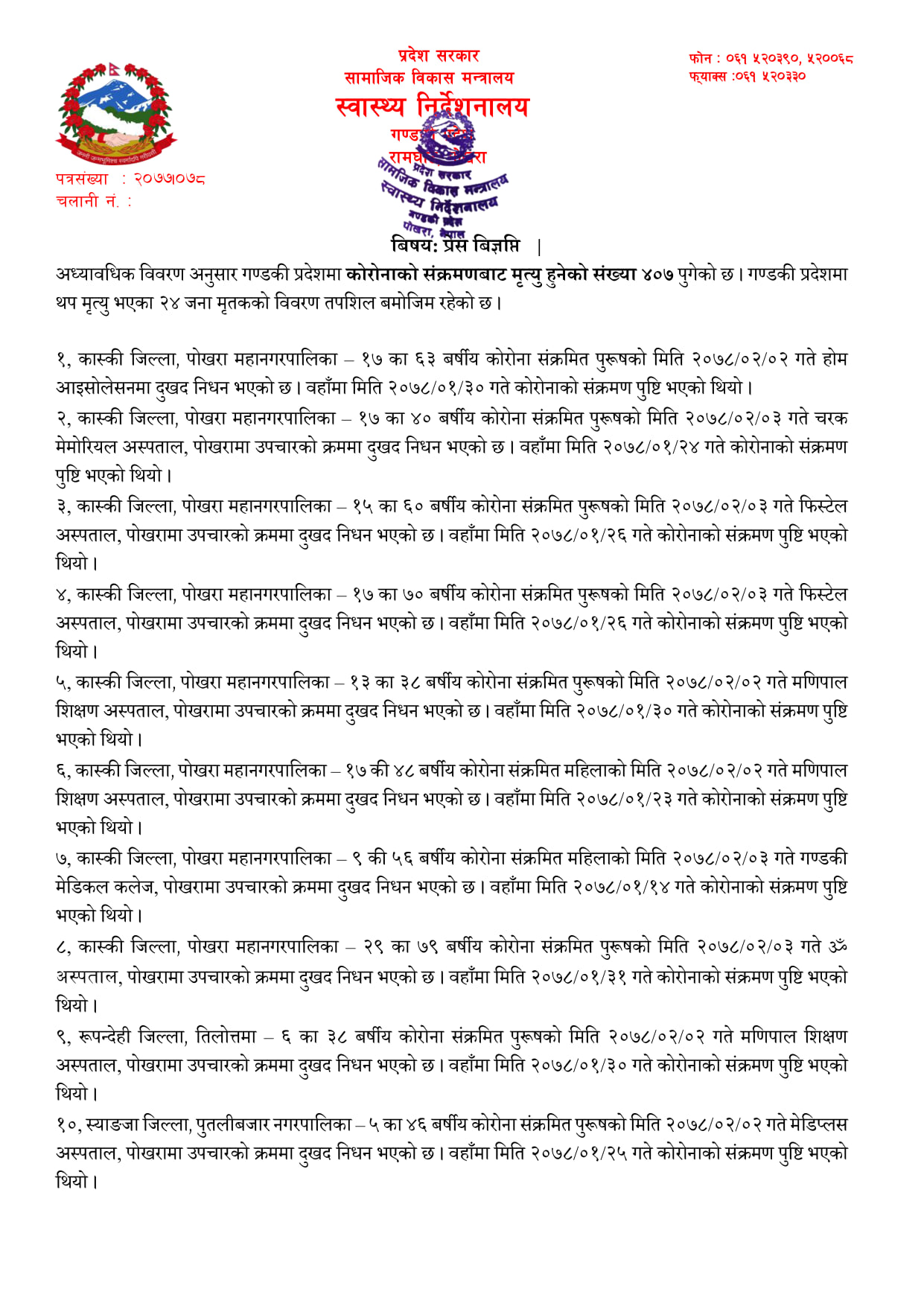 मृत्यु भएका मध्य आठ जना पोखरा महानगरपालिकाका रहेका छन भन्े चार जना स्यांजा, तनहुँका २ जना अन्य पर्वत,गोरखा,बाग्लंग,रुपन्देहीका रहेका छन् । त्यस्तै स्यांजाका ५ जना, पर्वतका ३ जना,तनहुँका २ जना,म्याग्दी, गोरखा,लमजुंग,बागलुंग र नवलपरासी पूर्वका एकएक जनाको मृत्यु भएको छ । त्यस्तै गण्डकीमा ८५९ नयाँ संक्रमित थपिएका छन् । गण्डकीमा थपिएका मध्य ४०४ महिला र ४५५ पुरुष रहेका छन् । थपिएका मध्य ४०८ कास्कीका रहेका छन् । त्यस्तै नवलपरासीका १४२, लमजुंगका ७९,म्याग्दीका ८४,बागलुंगका ६२,स्यांजका ३५,तनहुँका २३,पर्वतका २१ र मनांगका ५ जनामा संक्रमण पुष्टि भएको स्वास्थ्य निर्देशनालय गण्डकीले जनएको छ ।
