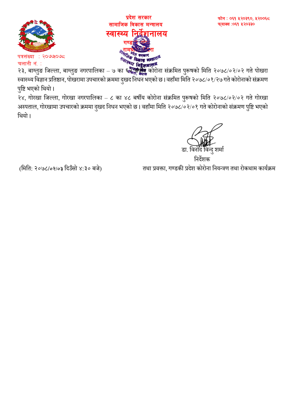 पोखरा, जेठ ३ गते । गण्डकी प्रदेशमा पछिल्लो २४ घण्टामा २४ जना कोरोना संक्रमितको मृत्यु भएको छ । स्वास्थ्य निर्देशनालय गण्डकी प्रदेशले सार्वजनी गरेको पछिल्लो विवरण अनुसार कास्कीका ९ सहित गण्डकीमा २४ जनाको उपचारका क्रममा मृत्यु भएको हो ।
