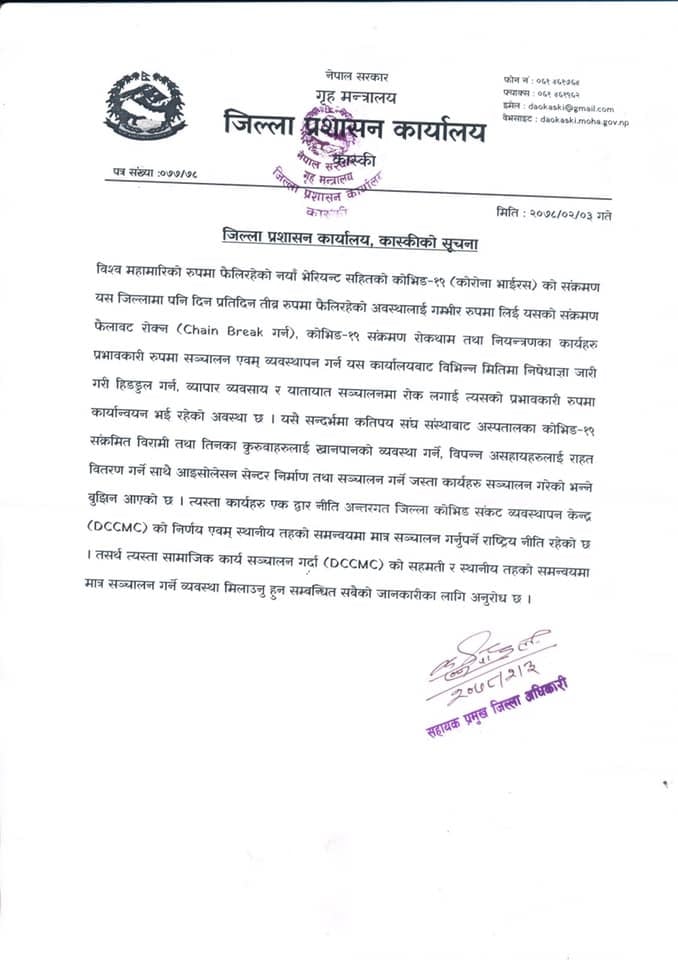 अस्पतालका कोरोना संक्रमित विरामी तथा आइसोलेसन सेन्टर निर्माण तथा सञ्चालन गर्ने जस्ता कार्यहरु सञ्चालन, संक्रमित विरामी तथा तिनका कुरुवाहरुलाई खानपानको व्यवस्था र राहत वितरण गर्ने कार्यहरु गर्दा स्थानीय तहसंगको समन्वयमा मात्र सञ्चालन गर्ने व्यवस्था मिलाउन सम्वन्धि सबैको लागि जानकारीको लागि अनुरोध गरेको छ । कास्कीका प्रमुख जिल्ला अधिकारीको हस्ताक्षरमा सोमबार जारी गरिएको सुचनामा भनिएको छ, सबै कार्यहरु एकद्धार नीति अन्र्तगत जिल्ला संकट व्यवस्थापन केन्द्रको निर्णय र स्थानीय तहको समन्वयमा गर्नुपर्ने राष्टिय नीति रहेको उल्लेख गरिएको छ ।