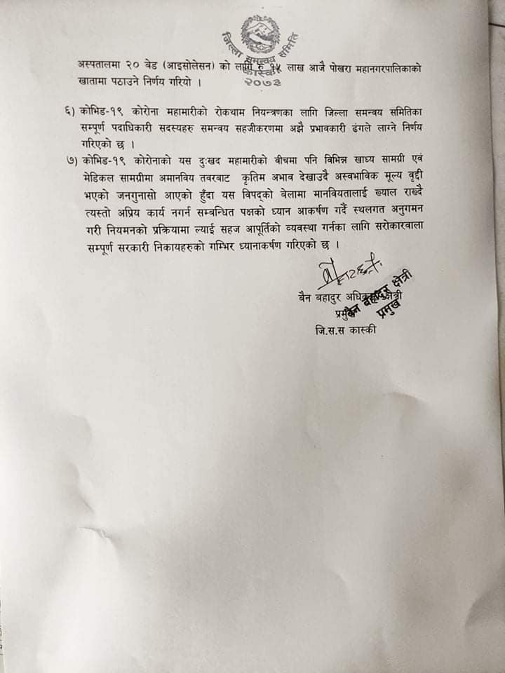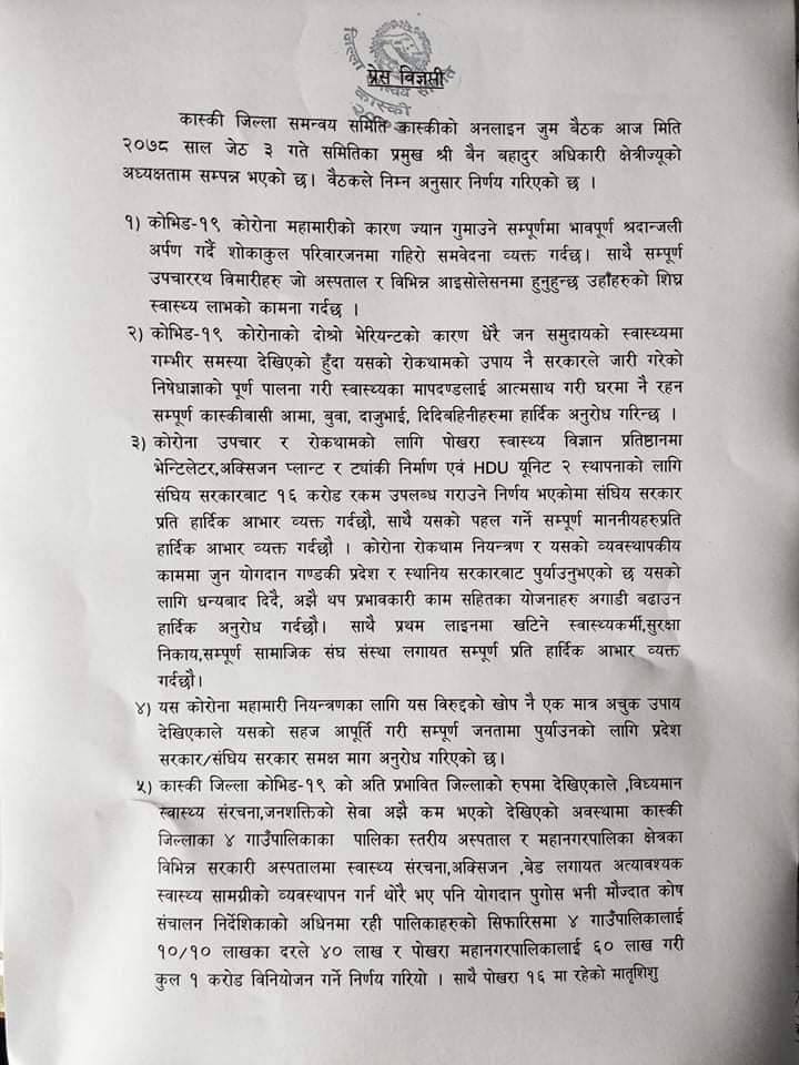 जिल्ला समन्वय प्रमुख बैनबहादुर क्षेत्री अधिकारीको अध्यक्षतामा बसेको बैठकले कास्की जिल्ला कोरोना संक्रमण अति प्रभावित जिल्लाको रुपमा रहेकाले विद्यमान स्वास्थ्य संरचना, जनशत्तिको सेवा अझै प्रभावकारी बनाउन कास्कीका चार गाँउपालिकाका पालिका स्तरीय अस्पताल र महानगरपालिका क्षेत्रका सरकारी अस्पताललाई रकम उलपब्ध गराउने निर्णय भएको प्रमुख अधिकारीले जानकारी दिनुभयो । समन्वयको मौज्दात कोष सञ्चालन निर्देशिकाको अधिनमा रहेर पालिकाहरुको सिफारिसमा चार गाँउपालिकालाई दश÷दश लाखका दरले ४० लाख र पोखरा महानगरपालिकालाई ६० लाख रुपैयाँ गरी १ करोड रुपैयाँ विनियोजन गर्ने निर्णय गरिएको प्रमुख अधिकारीले जानकारी दिनुभयो ।