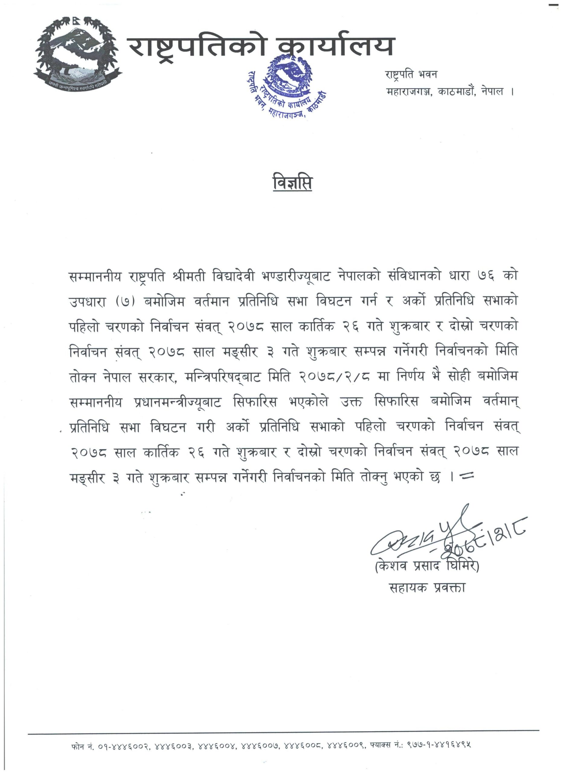 कठमाडौ, जेठ ८ गते । राष्ट्रपति विद्यादेवी भण्डारीले प्रतिनिधिसभा विघटन गरी आगामी कातिक २६ गते पहिलो चरण र मङ्सिर ३ गते दोस्रो चरणका निर्वचनको घोषणा गर्नु भएको छ ।