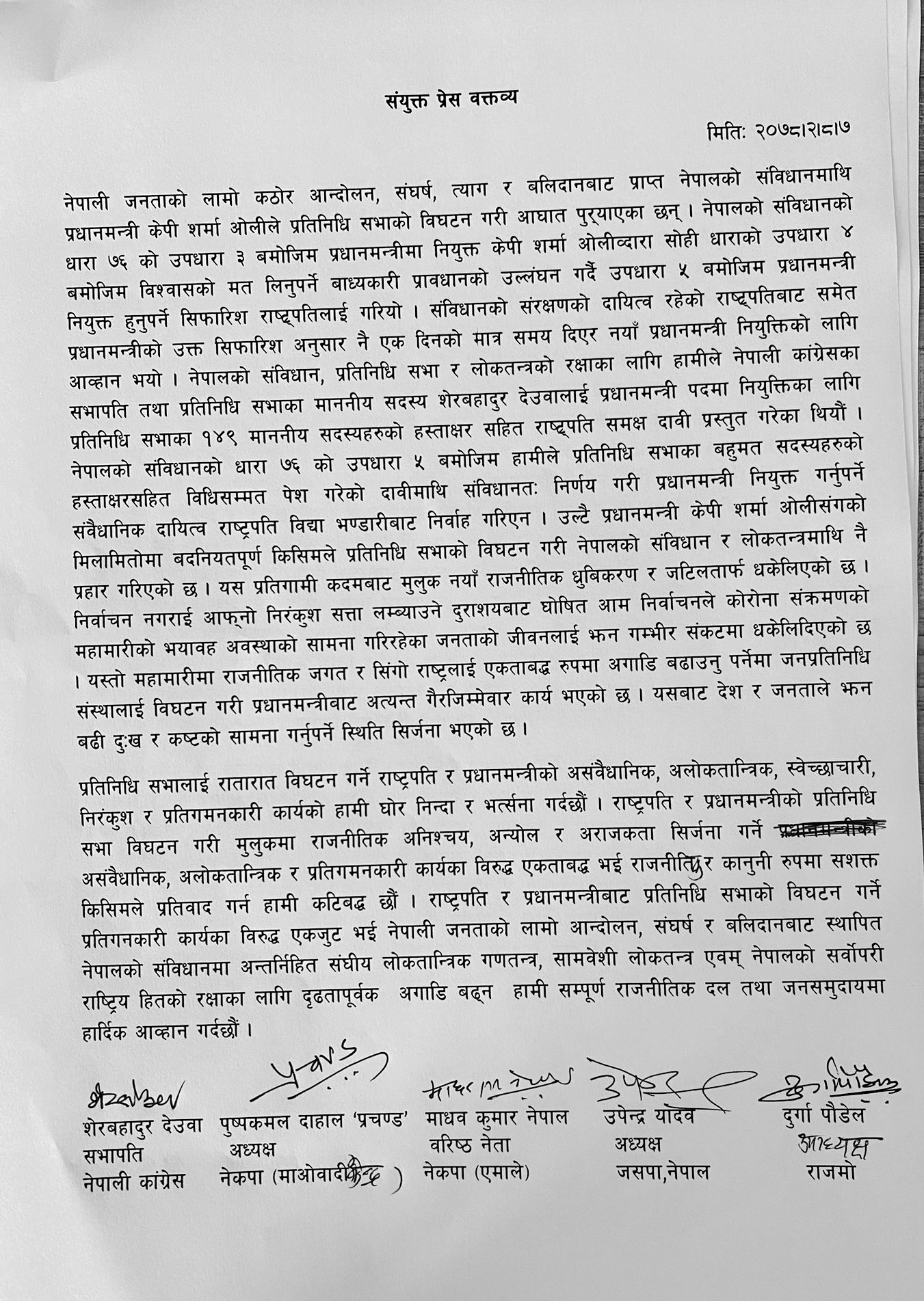 बैठकमा नेपाली कांग्रेसका सभापति शेरबहादुर देउवा, नेकपा माओवादी केन्द्रका अध्यक्ष पुष्पकमल दाहाल, नेकपा एमालेका वरिष्ठ नेता माधव कुमार नेपाल, जसपाका अध्यक्ष उपेन्द्र यादव र बाबुराम भट्टराई, राष्ट्रिय जनमोर्चासहितका नेताहरुको बैठकले राजनीतक प्रतिवादका साथै कानुनी लडाइँका लागि सर्वोच्च अदालत जाने निर्णय गरेको छ ।
