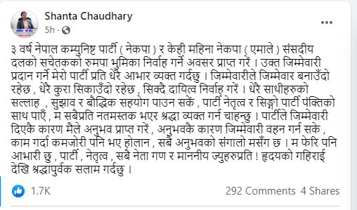 ‘जिम्मेवारीले जिम्मेवार बनाउँदो रहेछ,’ उनले लेखकी छिन्, धेरै कुरा सिकाउँदो रहेछ, सिक्दै दायित्व निर्वाह गरेँ। धेरै साथीहरुको सल्लाह, सुझाव र बौद्धिक सहयोग पाउन सकेँ । पार्टी नेतृत्व र सिंगो पार्टी पंक्तिको साथ पाएँ । म सबैप्रति नतमस्तक भएर श्रद्धा व्यक्त गर्न चाहन्छु ।’चौधरीले प्रतिनिधिसभामा दाङबाट प्रतिनिधित्व गरेकी थिइन् ।
