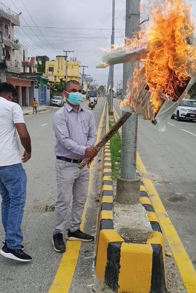 पोखरा, जेठ ११ गते ।बिरगंजमा भीम रावलको पुत्ला दहन गरिएको छ । भ्रमपूर्ण प्रचार गरि संप्रदायिकता भड़काउन खोजेको आरोप लगाउदै बिरगंजमा पुत्ला दहन गरिएको हो ।