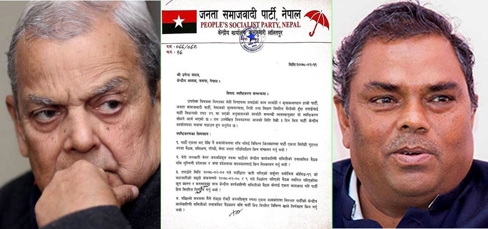 काठमाडौं, जेठ १२ गते । जनता समाजवादी पार्टीका अध्यक्ष महन्थ ठाकुरले अर्का अध्यक्ष उपेन्द्र यादवसँग स्पष्टीकरण सोध्नुभएको छ । उपेन्द्र यादवले पार्टीको मूल्यमान्यता, नीति तथा विधान विपरित गतिविध गरेको भन्दै पार्टी विधानको दफा ४९ मा भएको अनुशासनको कारबाही सम्बन्धी व्यवस्था अनुसार स्पष्टीकरण सोधिएको ठाकुरद्वारा जारी विज्ञप्तिमा उल्लेख छ । साथै यादवलाई तीन दिनभित्र जवाफ पठान भनिएको छ ।