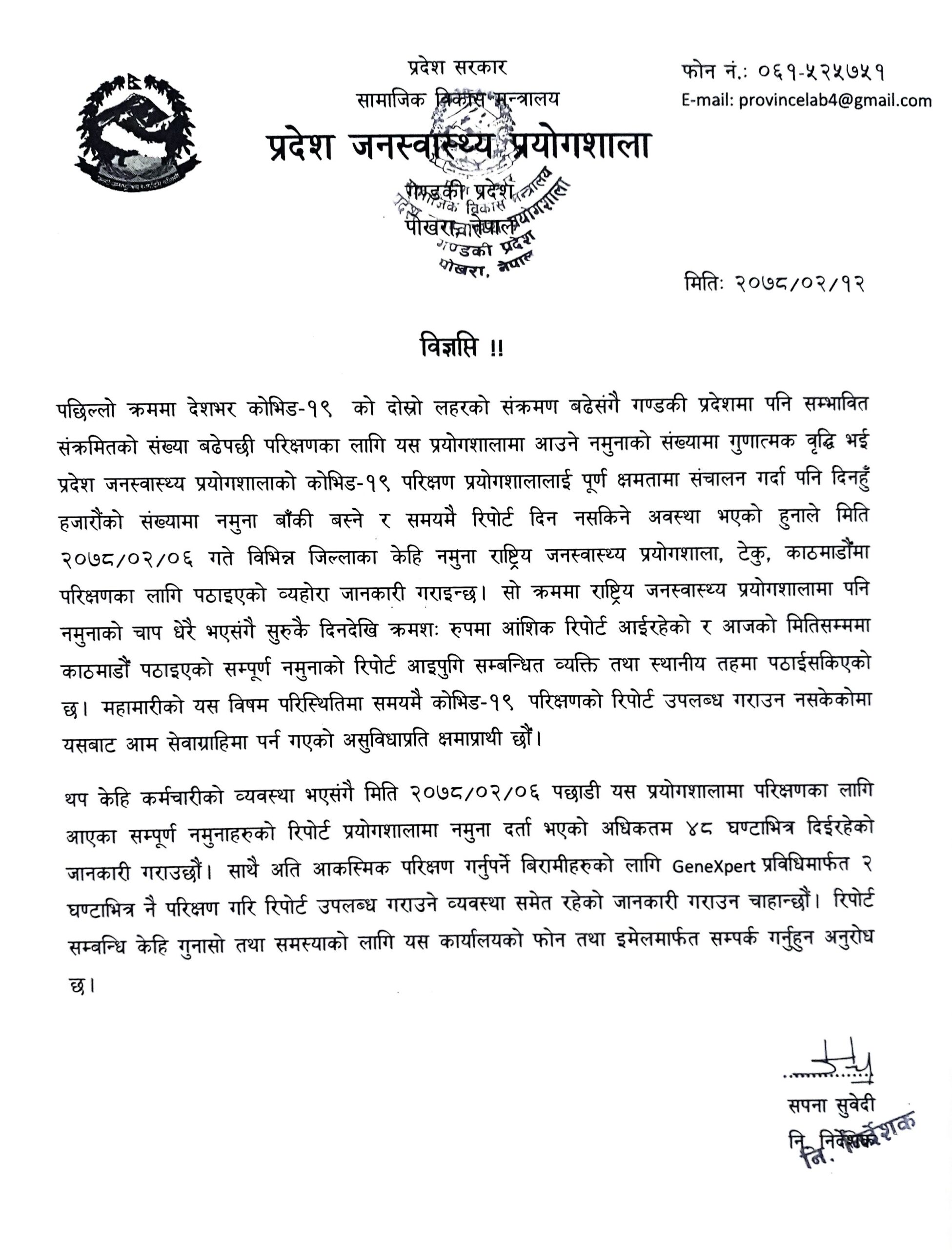 प्रदेश जनस्वास्थ्य प्रयोगशालाकी निमित्त निर्देशक सपना सुवेदीद्वारा हस्ताक्षरीत विज्ञप्तीमा पछिल्लो क्रममा देशभर कोभिड–१९  को दोस्रो लहरको संक्रमण बढेसंगै गण्डकी प्रदेशमा पनि सम्भावित संक्रमितको संख्या बढेपछी परिक्षणका लागि यस प्रयोगशालामा आउने नमुनाको संख्या बढेको उल्लेख छ । विज्ञप्तीमा नमुनाको संख्या गुणात्मक वृद्धि भई प्रदेश जनस्वास्थ्य प्रयोगशालाको कोभिड–१९ परिक्षण प्रयोगशालालाई पूर्ण क्षमतामा संचालन गर्दा पनि केही नमुना बाँकी बस्ने र समयमै रिपोर्ट दिन नसकिने अवस्था सृजना भए पछि प्रदेश भित्रका केही जिल्लाका नमुना राष्ट्रिय जनस्वास्थ्य प्रयोगशाला, टेकु, काठमाडौँमा परिक्षणका लागि पठाइएर समेत समयमै नतिजा दिन प्रयास गरेको तर त्यहाँ पनि उस्तै अवस्था रहेकोले केहि दिन ढिला हुन गएको उल्लेख छ । काठमाडौं नमुना पठाउँदा काठमाडौं नमुना पठाइएको दिन देखिनै आंशिक रुपमा रिपोर्ट आईरहेको र बुधबार सम्ममा काठमाडौँ पठाइएको सम्पूर्ण नमुनाको रिपोर्ट समेत सबैले प्राप्त गरेको हुनाले अब सो समस्या हटेको निमित्त निर्देशक सुवेदीले बताइन् ।