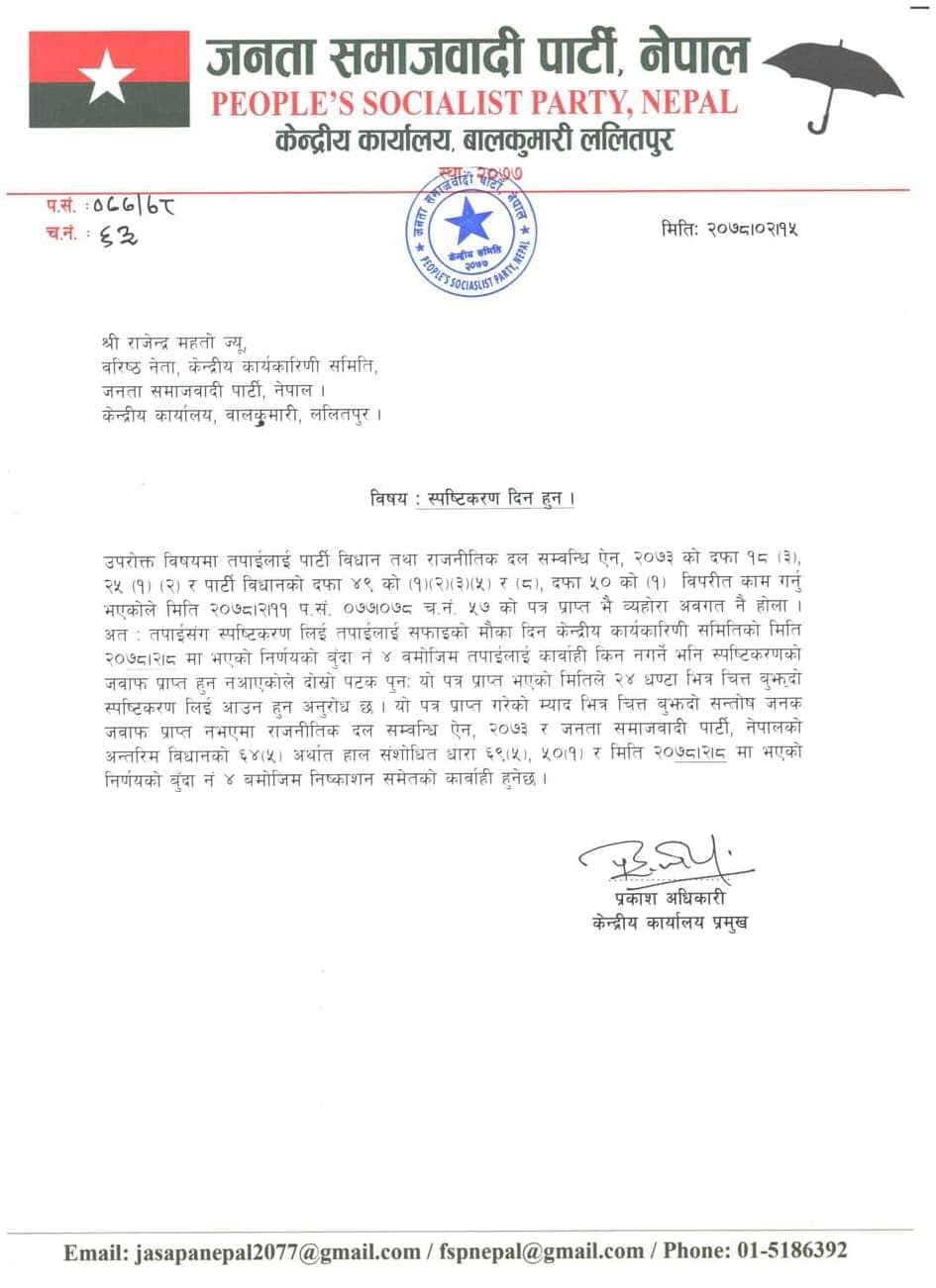पार्टीले सोधेको स्पष्टीकरणको जवाफ नदिएको भन्दै ठाकुर, राजेन्द्र महतो, लक्ष्मणलाल कर्ण र सर्वेन्द्रनाथ शुक्ललाई दोस्रोपटक स्पष्टीकरण सोधेको हो।दोस्रो पत्र प्राप्त भएको मितिले २४ घण्टाभित्र चित्त बुझ्दो स्पष्टीकरण बुझाउन भनिएको केन्द्रीय कार्यालय प्रमुख प्रकाश अधिकारीद्वारा हस्ताक्षरित पत्रमा जवाफ नदिए पार्टीबाट निष्कासनको कारवाही गर्ने चेतावनी दिइएको छ ।यसअघि उपेन्द्र यादवलाई ठाकुरले तीन दिने स्पष्टीकरणको पत्र बुझाएका थिए ।