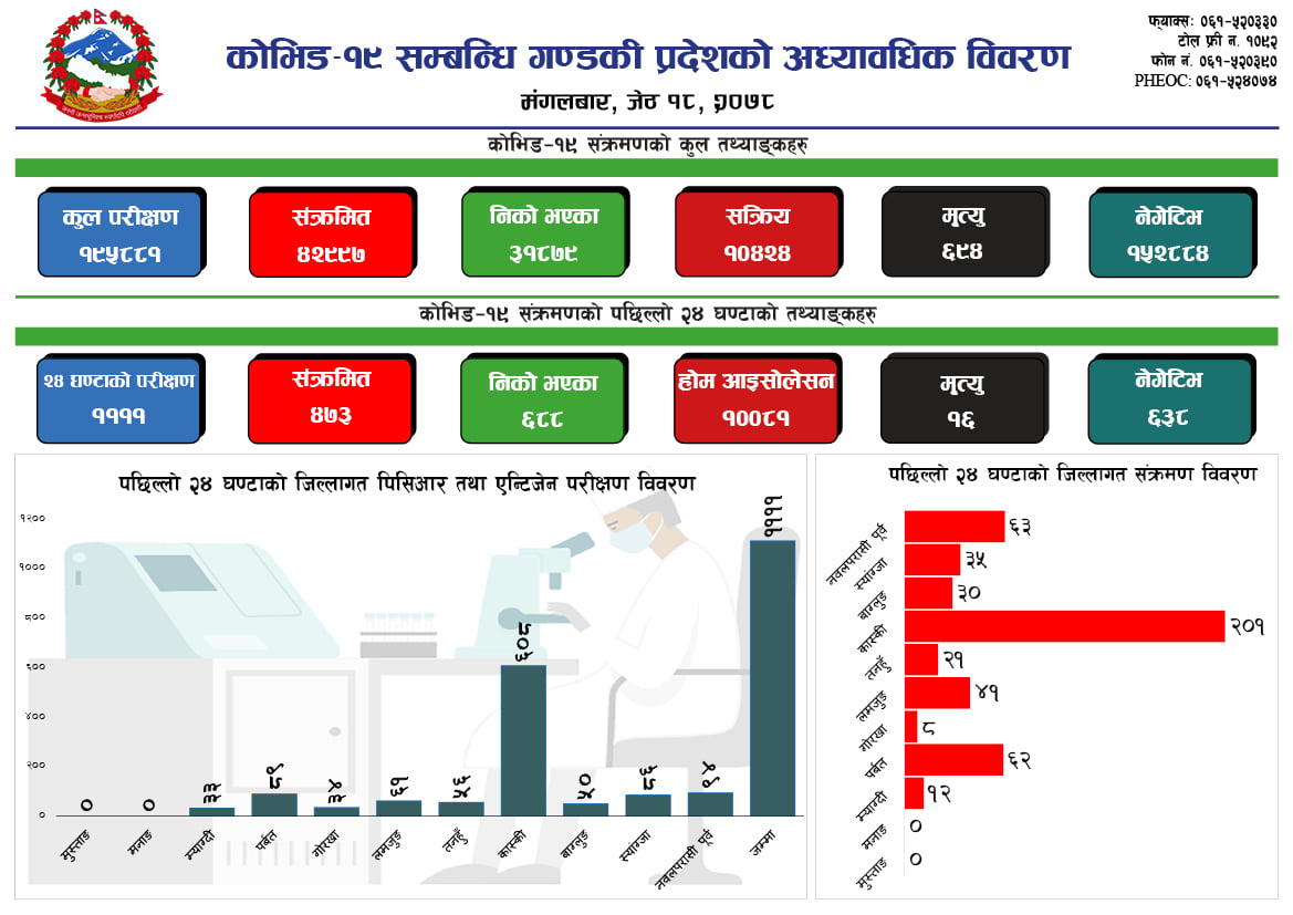 मृतकहरु कास्कीका ३ जना, तनहुँ जिल्लाका २ जना, स्याङ्जाका ३ जना, बाग्लुङका १ जना, म्याग्दीका १ जना, पर्वत जिल्लाका १ जना, नवलपुरका ४ जना र रुपन्देहीका १ जना रहेको प्रदेश स्वास्थ्य निर्देशनालय पोखराले जनाएको छ ।त्यस्तै गण्डकीमा मंगलबार ६८८ जना कोराना संक्रमणमुक्त भएका छन् भने ४७३ नयाँ संक्रमित थपिएका छन् । गण्डकीमा सक्रिय संक्रमितको संख्या १०४२४ पुगेको छ । सक्रिय संक्रमित मध्य १००८१ जना होमआइसोलेसनमा रहेका छन् ।