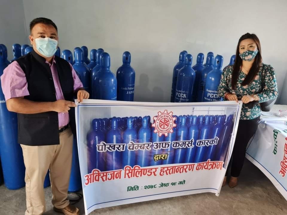 चेम्बर अफ कमर्स कास्कीका अध्यक्ष किसान सुनार र कास्की पोखरा जापानका महिला उपाध्यक्ष अन्जु भण्डारीले महानगर प्रमुख मानबहादुर जिसीलाई सिलिण्डर हस्तान्तरण गर्नुभयो । प्रमुख जिसीले अक्सिजन सिलिण्डरले कोभिडका बिरामीलाई उपचारमा सहयोग पुग्ने बताउनुभयो । उहाँले महानगरले वडा नम्बर २७ को वडा कार्यालय साविक लेखनाथ नगरपालिकाको भवनमा कोभिड अस्पताल सञ्चालन गरेको जानकारी दिनुभयो । महागनर १ सय बेडको अस्पताल निर्माण गरेको छ । अस्पतालमा २ करोड रुपैयाँ खर्च गरिएको छ ।