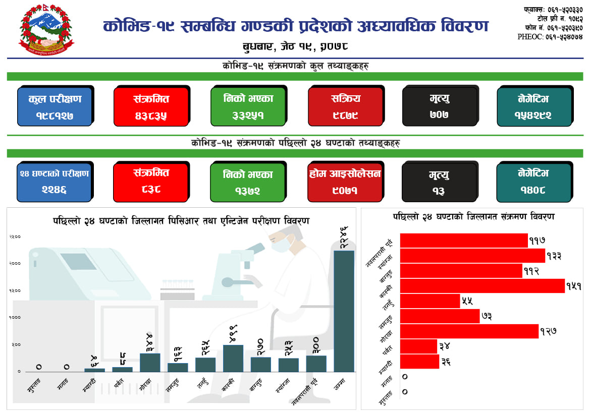 गण्डकीमा पछिल्लो समय कोरोना संक्रमण निको हुने दर बढेको छ । हालसम्म गण्डकीमा ३३२५१ जना कोरोना संक्रमणमुक्त भएका छन् भने हाल संक्रिय संक्रमितको संख्या ९८७९ जना रहेका छन् । गण्डकीमा कुल परीक्षण १९८१२७ जनाको भएको छ । गण्डकीमा कोरोना संक्रमणबाट ७०७ जनाले ज्यान गुमाएका छन् । यता बुधबार गण्डकीमा १३ जनाको मृत्यु भएको छ । गण्डकी प्रदेशका विभिन्न अस्पतालमा उपचाररत कोरोना संक्रमितको पछिल्लो २४ घण्टामा मृत्यु भएको स्वास्थ्य निर्देशनालयले जारी गरेको विवरणमा उल्लेख गरिएको छ ।