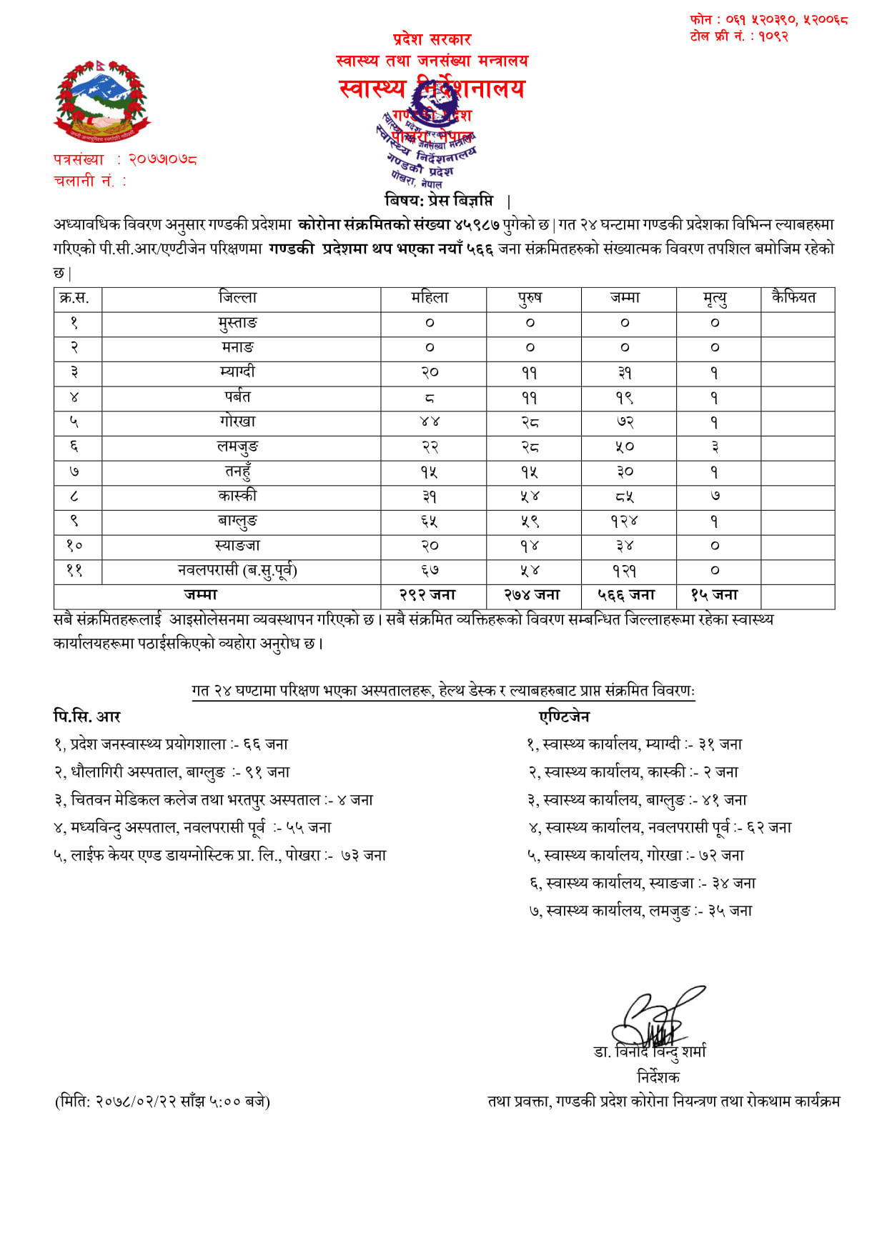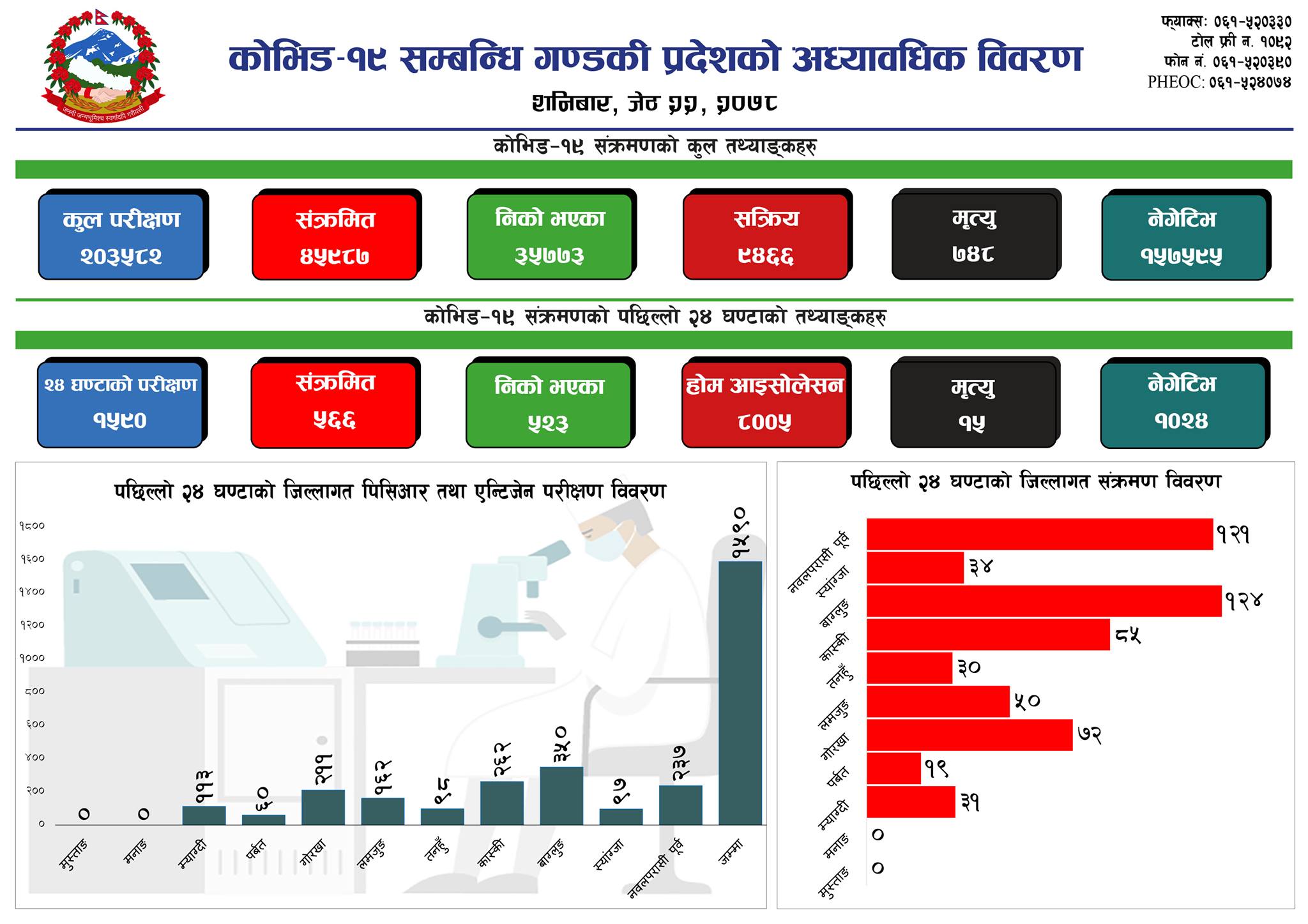 २४ घण्टामा १५० जनाको स्वाब परीक्षण गरिएको थियो भने १०२४ को नेगेटिभ आएको थियो । गण्डकीमा अहिलेसम्म २०३५८२ जनाको परीक्षण गरिएकोमा ४५९८७ जना संक्रमित भएका छन् । संक्रमित मध्य ३५७७३ जनाले कोरोनालाई जितेका छन् । गण्डकीमा हाल ९४६६ संक्रिय संक्रमित रहेका छन् भने होम आइसोलेसनमा ८००५ जना रहेका छन् ।