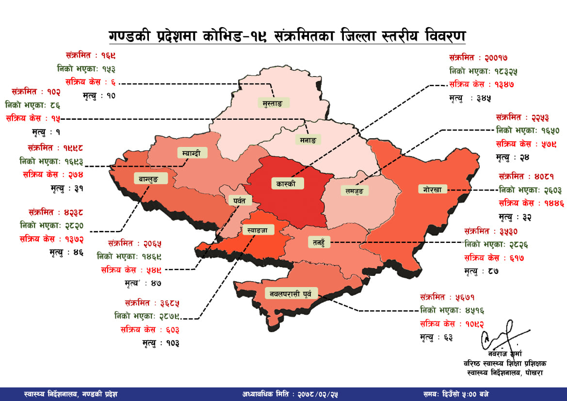 मृत्यु भएका मध्य कास्कीका ३ जना, नवलपरासीका १ जना, तनहुँका १ जना, पर्वतका २ जना, लमजुंगका १ जना र स्यांजाका २ जना संक्रमितको मृत्यु भएको छ । गण्डकीमा अहिलेसम्म ७८९ जनाको मृत्यु भएको छ ।गण्डकीमा मंगलबार ५१८ नयाँ संक्रमित थपिएका छन । थपिएका मध्य कास्कीका २३२, नवपरासीका ३१, स्यांजाका १२, बाग्लुंगका १७, तनहुँ ५, लम्जुलंगका १२, गोरखा १०६, पर्वत ८७, म्याग्दीका १५ जना र मुस्तांगका १ मा संक्रमण पुष्टि भएको छ ।