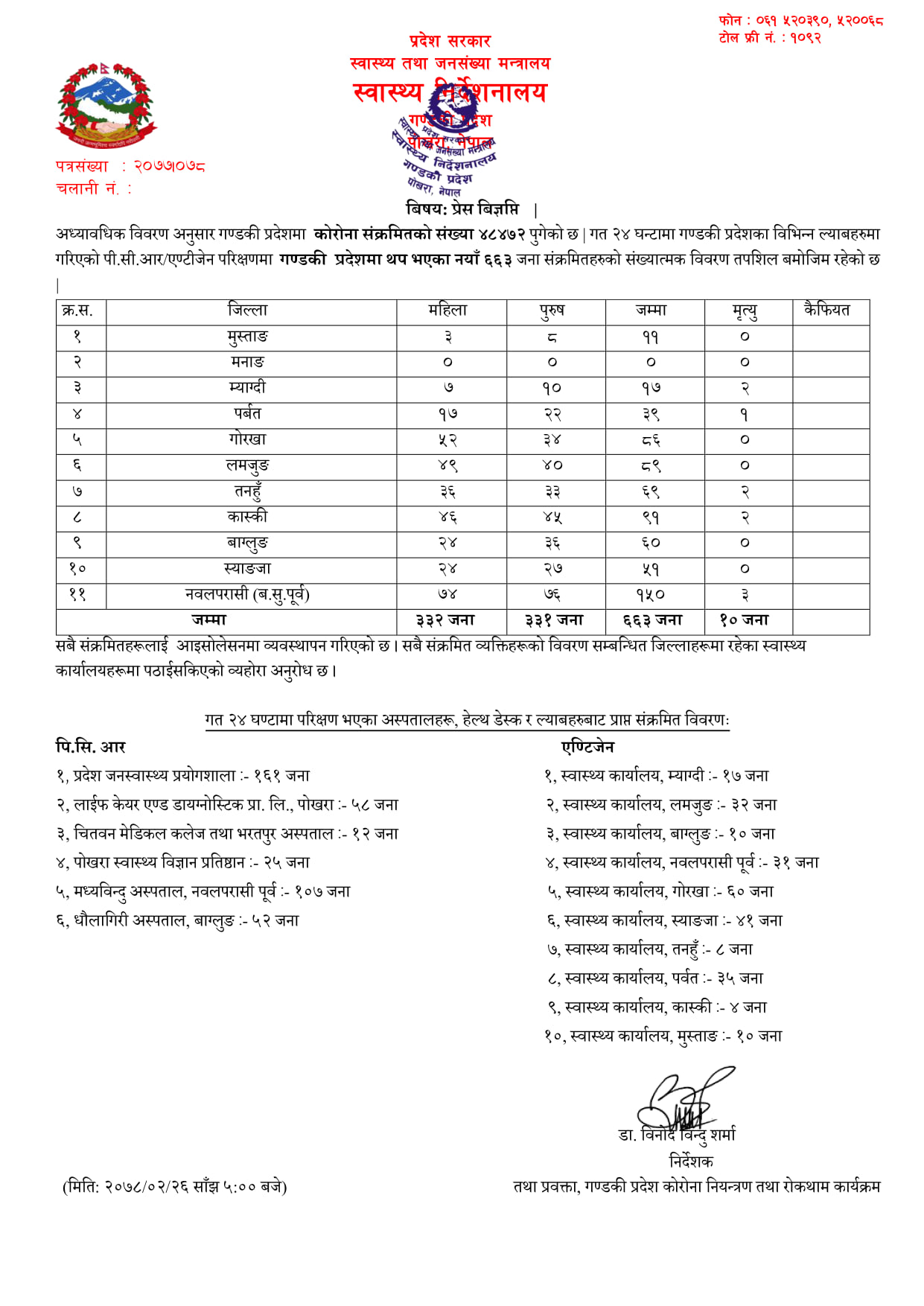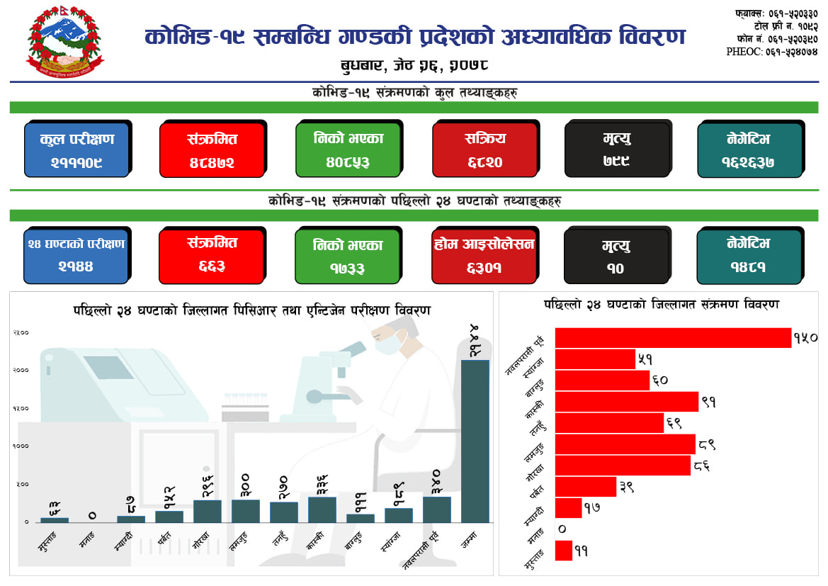 मृत्यु भएका मध्य कास्कीका २ जना, नवलपरासीका ३ जना, तनहुँका २ जना, पर्वतका १ जना, म्याग्दी २ जना संक्रमितको मृत्यु भएको छ । गण्डकीमा बुधबार ६६३ नयाँ संक्रमित थपिएका छन । ३३२ पुरुष र ३३१ नयाँ थपिएका हुन । थपिएका मध्य कास्कीका ९१, नवपरासीका १५०, स्यांजाका ५१, बाग्लुंगका ६०, तनहुँ ६९, लम्जुलंगका ८९, गोरखा ८६, पर्वत ३९, म्याग्दीका १७ जना र मुस्तांगका ११ मा संक्रमण पुष्टि भएको छ ।