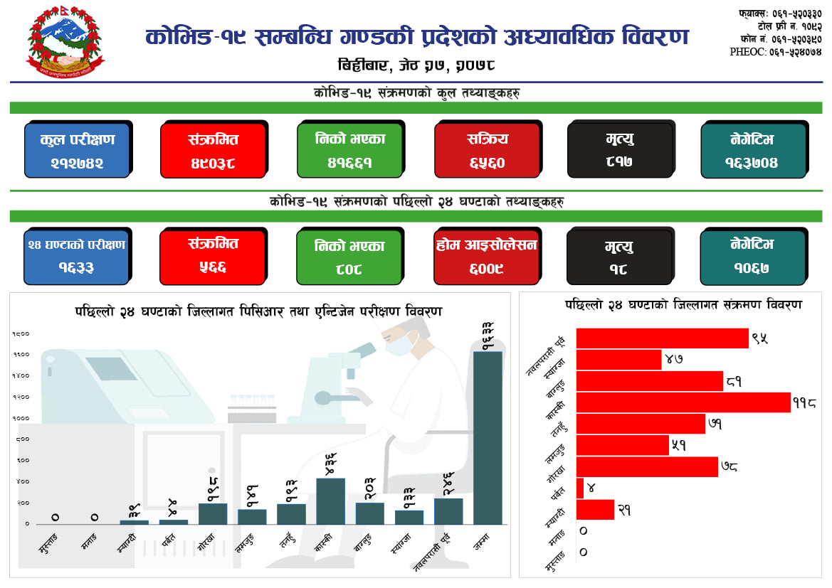 मृत्यु भएका मध्य कास्कीका ७ जना, गोरखाका ३ जना, नवलपरासीका २ जना, तनहुँका १ जना, म्याग्दी १ जना, बाग्लुंग ३ जना, स्यांजा १ जना, संक्रमितको मृत्यु भएको छ । गण्डकीमा बिहिबार ८०८ नयाँ संक्रमित थपिएका छन । ३३२ पुरुष र ३३१ नयाँ थपिएका हुन । थपिएका मध्य कास्कीका ११८, नवपरासीका ९५, स्यांजाका ४७, बाग्लुंगका ८१, तनहुँ ७१, लम्जुलंगका ५१, गोरखा ७८, पर्वत ४, म्याग्दीका २१ जनामा संक्रमण पुष्टि भएको छ ।