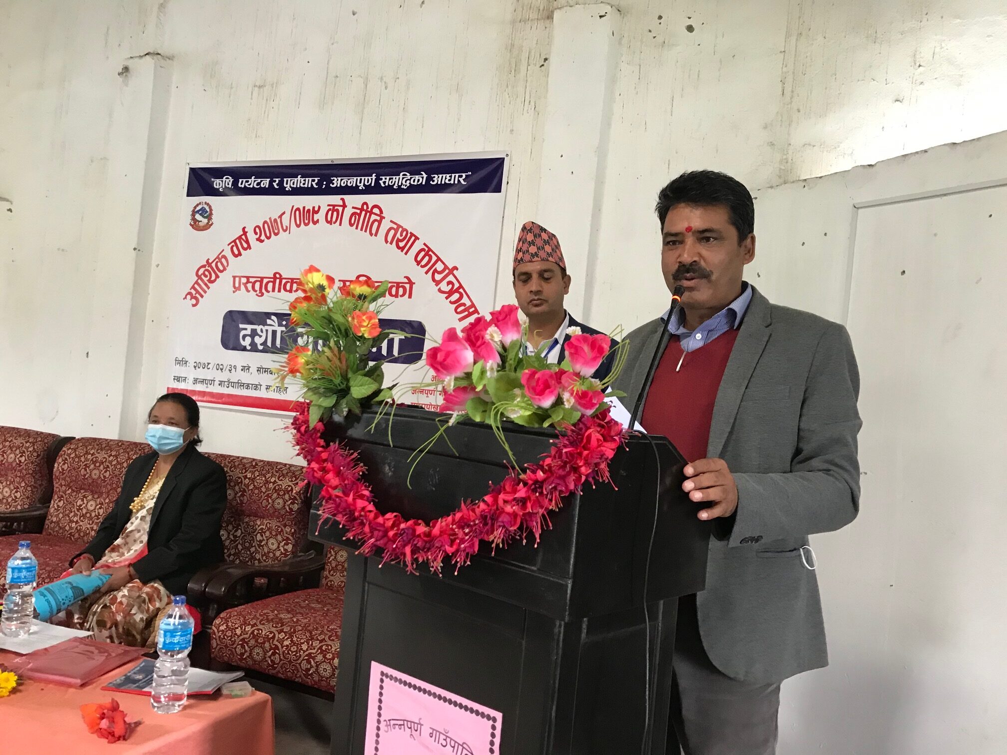 अन्नपूर्ण गाउँपालिकाका उपाध्यक्षज्यू,प्रमुख प्रशासकीय अधिकृतज्यू, वडा अध्यक्षज्यूहरु, गाउँकार्यपालिका सदस्यज्यूहरु, गाउँसभाका सदस्यज्यूहरु,सबै राष्ट्रसेवक कर्मचारीहरु, विभिन्नराजनीतिक दलका प्रतिनिधिज्यूहरु लगायत सम्पूर्ण स्थानीय गाउँपालिकाबासीहरु, सञ्चारकर्मी/पत्रकारज्यूहरु सबैलाई गाउँपालिकाको नीति तथा कार्यक्रम प्रस्तुत गर्न आयोजित दशौंगाउँसभामा हार्दिक स्वागत गर्न चाहन्छु ।