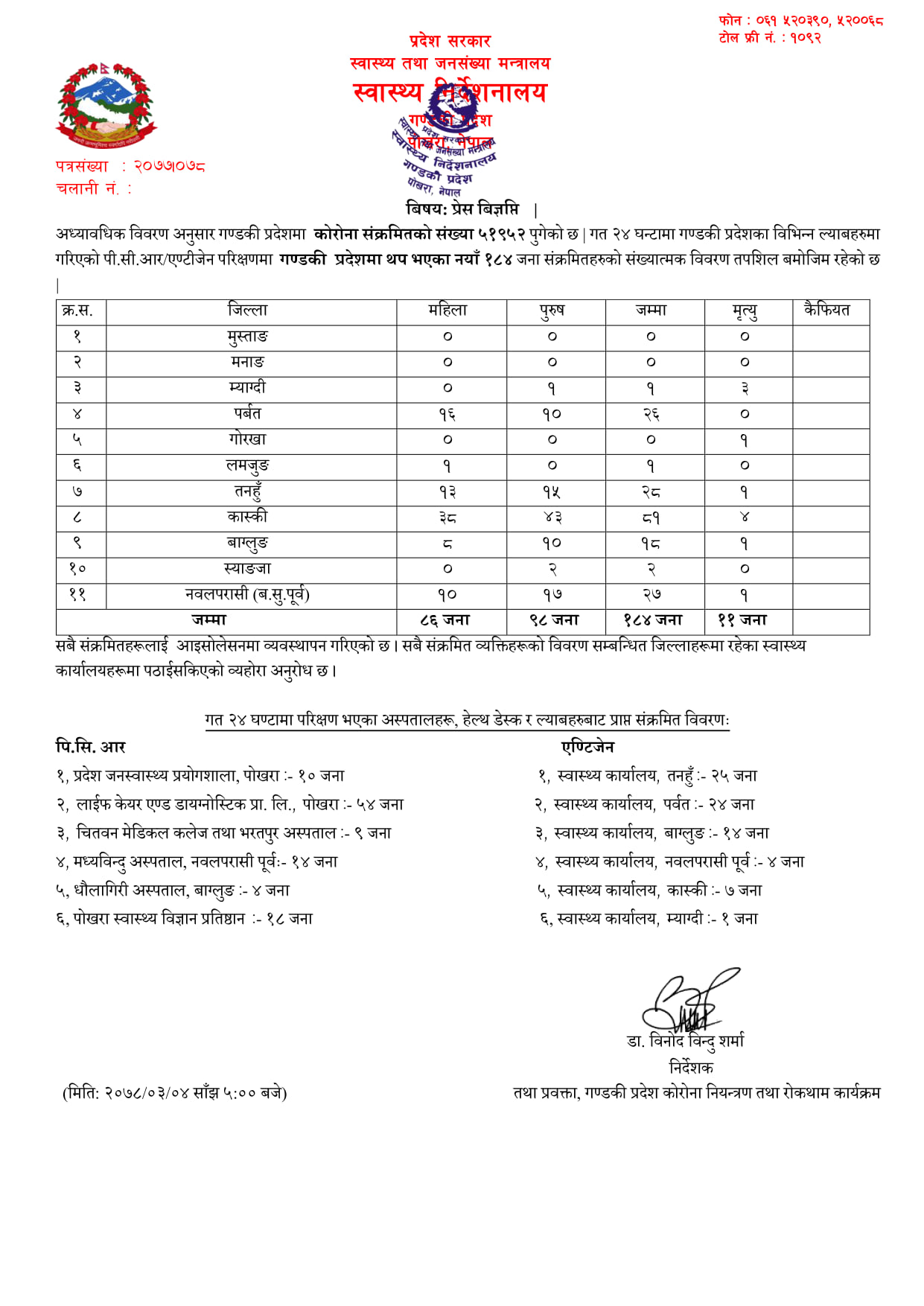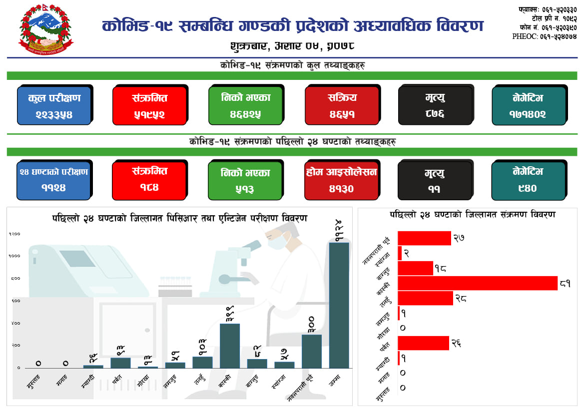 गण्डकीमा मृत्यु भएका मध्य कास्कीका ४ जना,म्याग्दीका ३ जना, गोरखाका १ जना, नवलपरासीका १ जना, बाग्लुुङका १ जना र तनहुँका १ जना रहेका छन् । गण्डकीमा पछिल्लो २४ घण्टामा १८४ नयाँ संक्रमित थपिएका छन् । थपिएका मध्य कास्कीका ८१ जना, नवलपरासीका २७ जना, तनहुँका २८ जना, बाग्लुङका १८ जना, पर्वतका २६ जना र म्यादीका १ जना रहेका छन् ।