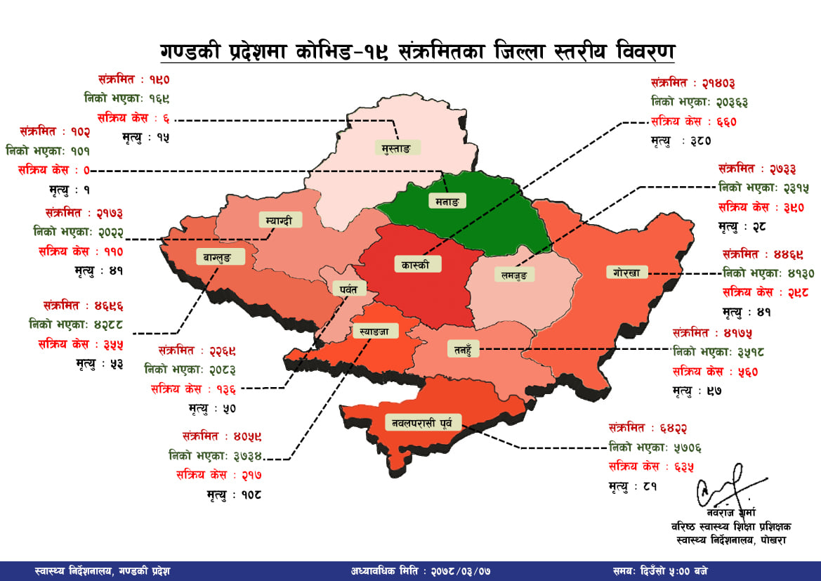मृत्यु भएका मध्य कास्कीका ३ जना, स्यांजाका १ जना, लम्जुंगका १ जना र म्याग्दीका १ जना संक्रमितको मृत्यु भएको छ ।