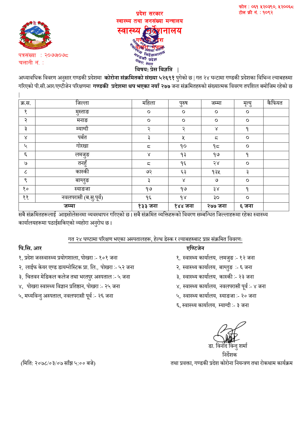 गण्डकीमा ६ जनाको मृत्यु, २७७ नयाँ थपिए, ६५५ संक्रमणमुक्त