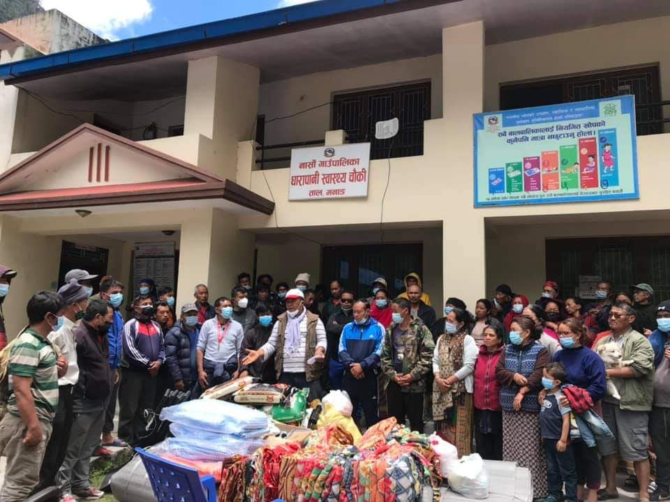 राहत सामग्रीको लागि मनकामना केवलकारका संचालक राजुबावु श्रेष्ठ,सिम्रिक एयरका एमडि रामेश्वर थापाबाट धेरै हेलिकप्टरको भाडा सहुलियत गरि हेलिकप्टरको भाडा, किष्ट हस्पिटलका एमडि आसिस थापा बाट ५० हजार, रामबजार निवासी दिपक बराल बाट ५० हजार, व्यवसायी भरत बरालबाट २५ हजार, तेज गुरूङबाट १० हजार, किसन मेसेनरी स्टोरका प्रोपाईटर मोहन प्रसाद ढकालबाट रू २३ हजार पाँच सय मुल्य बराबरको सामान,जिल्ला खेलकुद विकास समितिद्वारा तीन बोरा चामल र ३ पोका विभिन्न सामाग्री दाल,नुन,स्वाबिन,तेल,सहयोग गरेको गुरुङले बताउनुभयो ।