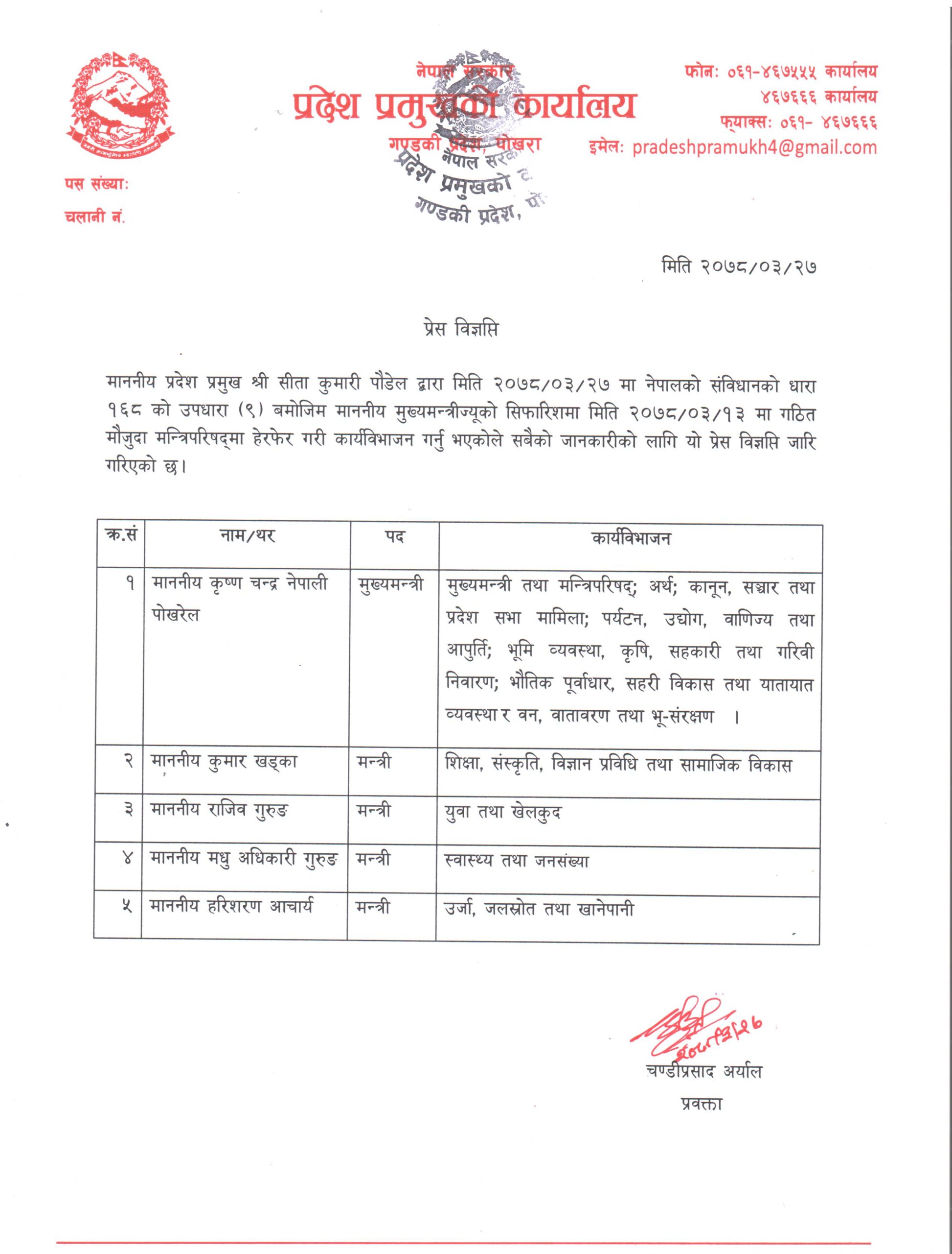 विश्वासको मत लिने दिन ४ असारमा कांग्रेस नेतृत्व सरकारले जसपालाई अर्थसहित २ मन्त्रालय दिने सहमति गरेपनि सहमति तोडेपछि विवाद भएको थियो भने अर्का मन्त्री मनाङेले आफूले भौतिक पूर्वाधार पाउनु पर्ने अडान राखेका थिए । दुवैले लचिलो हुदैँ जिम्मेवारी लिएका छन् । यो सँगै गण्डकीमा ४ जना मन्त्रीको जिम्मेवारीको टुंगो लागेको छ । यसअघि कुमार खड्काले सामाजिक विकास तथा मधुमाया अधिकारीले स्वास्थयको जिम्मा सम्हाल्नुभएको छ ।