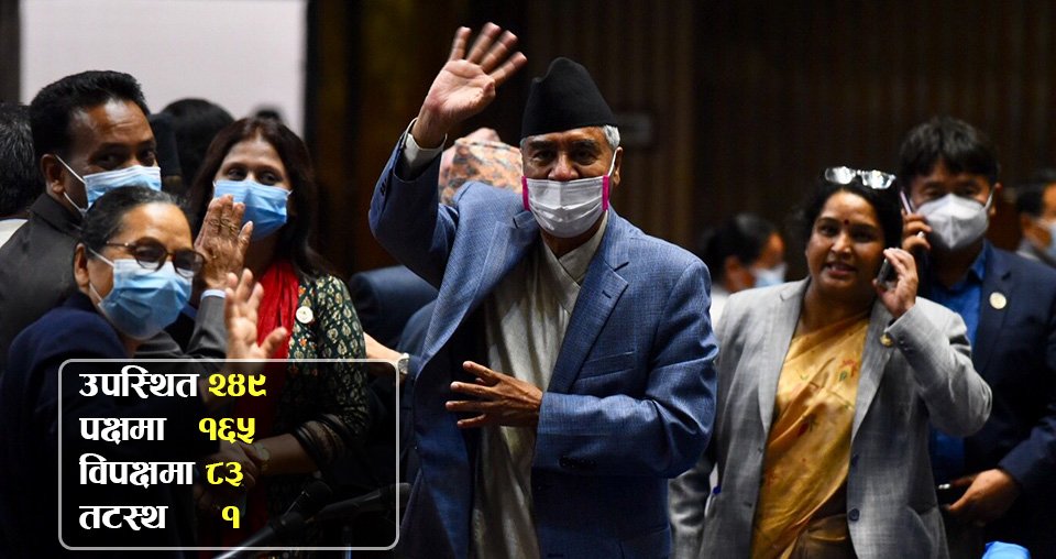 काठमाडौं । प्रधानमन्त्री शेरबहादुर देउवाले प्रतिनिधिसभामा विश्वासको मत प्राप्त गर्नुभएको छ । प्रधानमन्त्री देउवाले आफूमाथि प्रतिनिधिसभाको विश्वास छ भन्ने स्पष्ट पार्न विश्वासको मतको लागि प्रस्ताव प्रस्तुत गर्नुभएको थियो । मतदानमा २४९ उपस्थित हुनु भएकाे थियाे । मतदानमा उहाँको पक्षमा   १६५  मत खसेको छ भने विपक्षमा  ८३  मत परेको थियो । साथै    एक संसद तटस्थ रहनुभएको थियो । प्रधानमन्त्री देउवा असार २९ गते प्रधानमन्त्री नियुक्त हुनु भएकाे थियाे ।