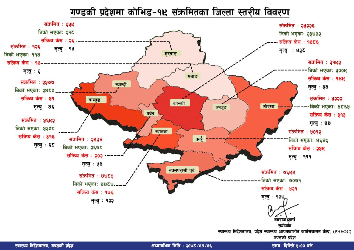 यस्तै कोरोना संक्रमणकै कारण नवलपुरमा पनि ७३ वर्षकी महिलाको चितवन मेडिकल कलेजमा मृत्यु भएको गण्डकी प्रदेश स्वास्थ्य निर्देशनालय अन्तर्गत आपतकालिन कार्यसञ्चालन केन्द्रका संयोजक नवराज शर्माले जानकारी दिनुभयो ।यो सहित गण्डकीमा कोरोना संक्रमणबाट मृत्यु हुनेको संख्या एक हजार ४१ जना पुगेको छ । गण्डकीमा पछिल्लो २४ घण्टामा २८१ जना निको भएको र ३६३ जनामा संक्रमण पुष्टि भएको छ ।