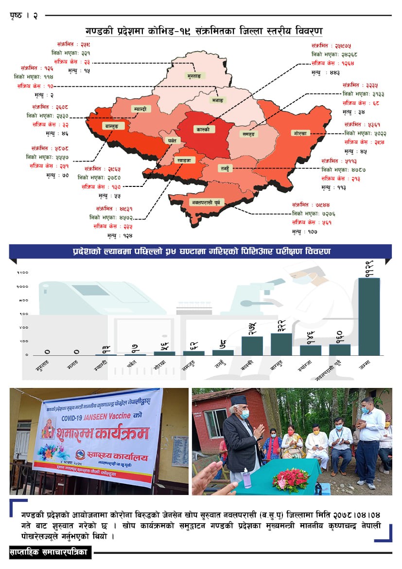 मृत्यु हुनेमा कास्कीका २ जना, बाग्लुंगका १ जना गोरखाका १ जना रहेका छन् । त्यस्तै पछिल्लो २४ घण्टामा गण्डकीमा ४४७ नयाँ संक्रमित थपिएका छन । कास्कीका २००, नवपरासीका ११, पर्वत ८, स्यांजाका ६७, बाग्लुगका १००, लम्जुगका १९ जना, म्याग्दकीका २ जना, २ मा संक्रमण पुष्टि भएको छ ।अहिलेसम्म गण्कडीमा संक्रमितको संख्या ६४३९५ पुगेको छ ।