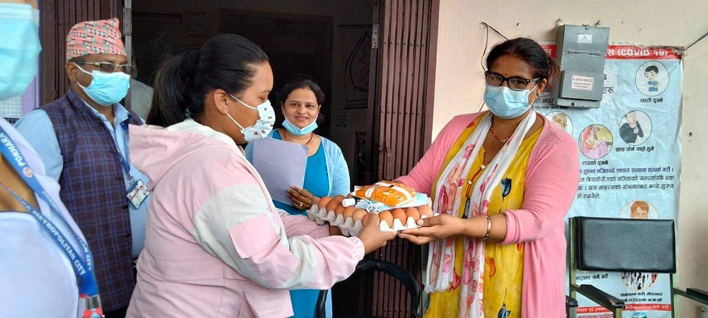 केन्द्रले सोमबार ४८ जना गर्भवती महिलाहरुलाई प्रति ब्यक्ति एक क्यारेट अण्डा,मास्क, घ्यू ,साबुन,सेनिटाइजर वितरण गरेको छ । वडा अध्यक्ष तिर्थराज अधिकारी, कार्यपालिका सदस्य राधिका शाही योगी लगायतले गर्भवती महिलाहरुलाई पौष्टिक आहार सहित स्वास्थ्य सामग्री वितरण गर्नुभयो । गर्भवती महिलाहरुलाई महानगरले सञ्चालन गरेको स्वास्थ्य केन्द्रमा नियमति स्वास्थ्य जाँचका लागि आउने वातारण बनाउन पौष्टिक आहार वितरण कार्यक्रम यही आर्थिकबाट सञ्चालन गरिएको कार्यपालिका सदस्य राधिका शाहीले बताउनुभयो ।