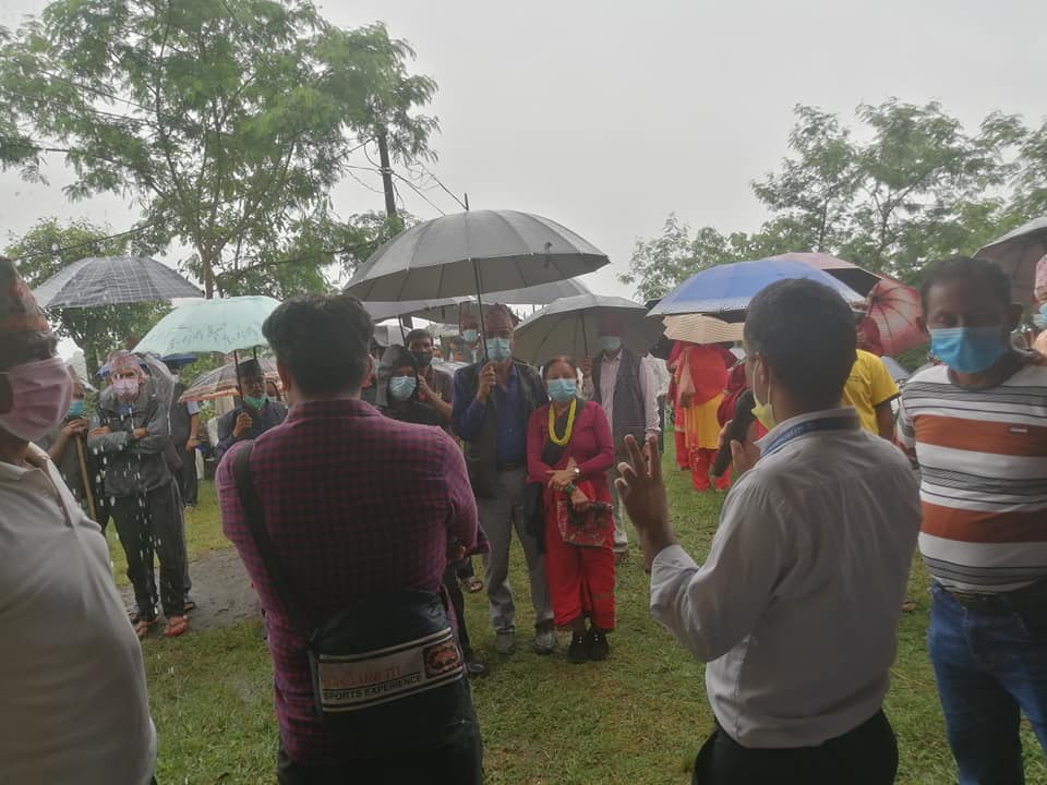 छाता ओढेर खोपको प्रतिक्षामा  नागरिक