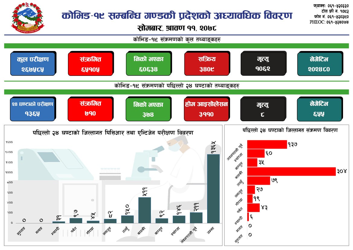 पोखरा, साउन ११ गते ।गण्डकी प्रदेशमा कोरोना भाइरस संक्रमण दर बढेको छ । पछिल्लो २४ घण्टामा ७१० नयाँ संक्रमित थपिएका छन् ।निषेधाज्ञा खुकुलो भएसंगै गण्डकी प्रदेशमा संक्रमण बढेको हो । गत बैशाखमा निषेधाज्ञा थपिएपछि घटेको संक्रमण दर सोमबार ह्वात्तै बढेको छ । गण्डकीका ११ जिल्ला मध्य कास्कीमा सबैभन्दा धेरै ३०४ जनामा संक्रमण पुष्टि भएको छ ।